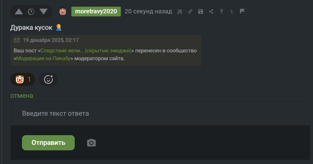 И тогда один из них - самый гнусный - придумал хитроумный, как ему казалось, план. Он начал ставить всем в теме реакции "клоун" и попытался обвинить в этом автора.