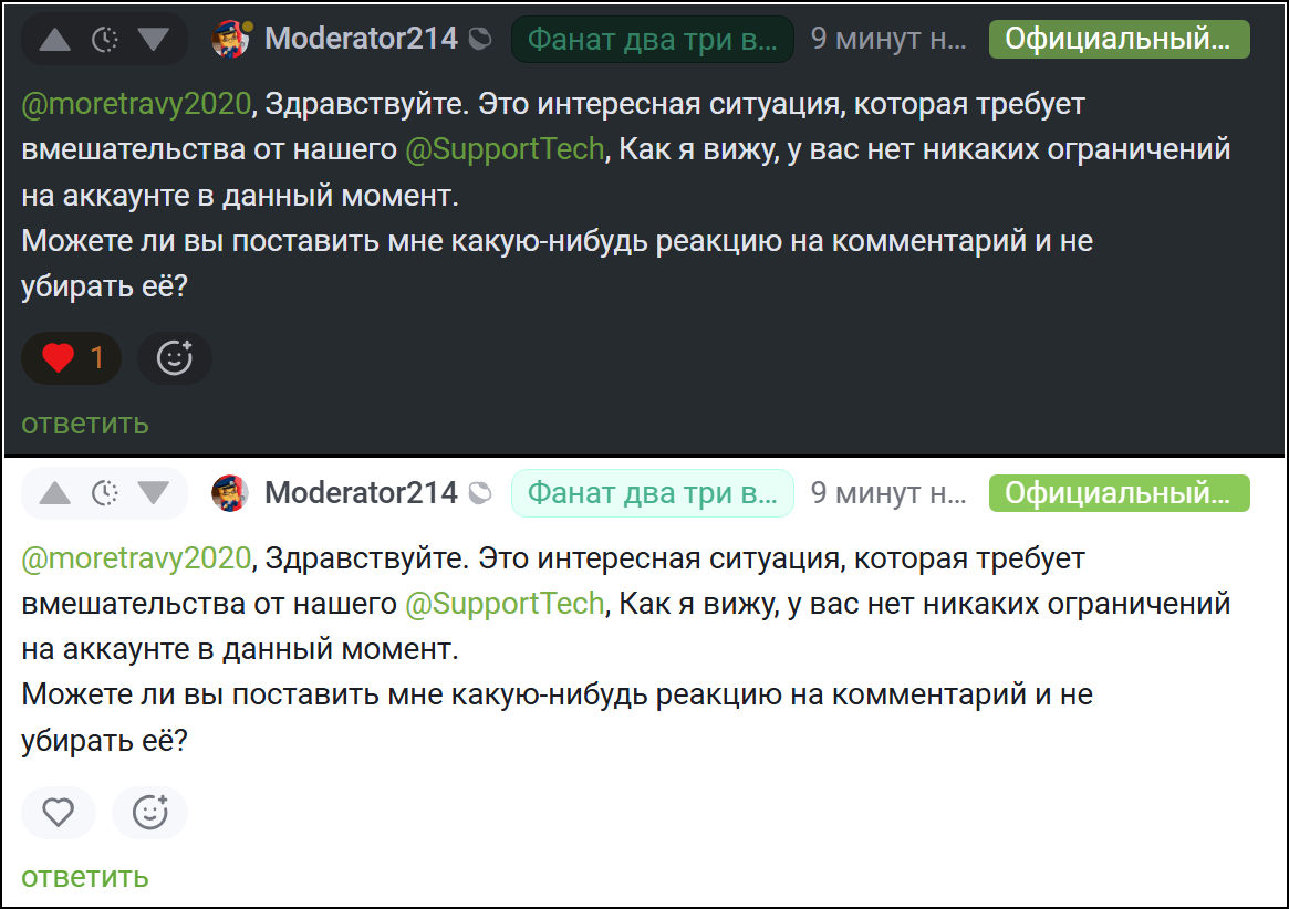 Сначала автор решил, что проблема касается только платных реакций, купленных за монетки. Такую возможность ввели на сайт совсем недавно, и версия бага выглядела правдоподобной. Он создал тему и вызвал в неё техподдержку.