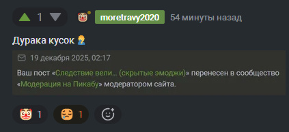 Техподдержка ответила осторожно. По их словам, всё произошло автоматически. Якобы пользователь злоупотреблял реакциями - ставил их слишком много. Система сработала. Так бывает.