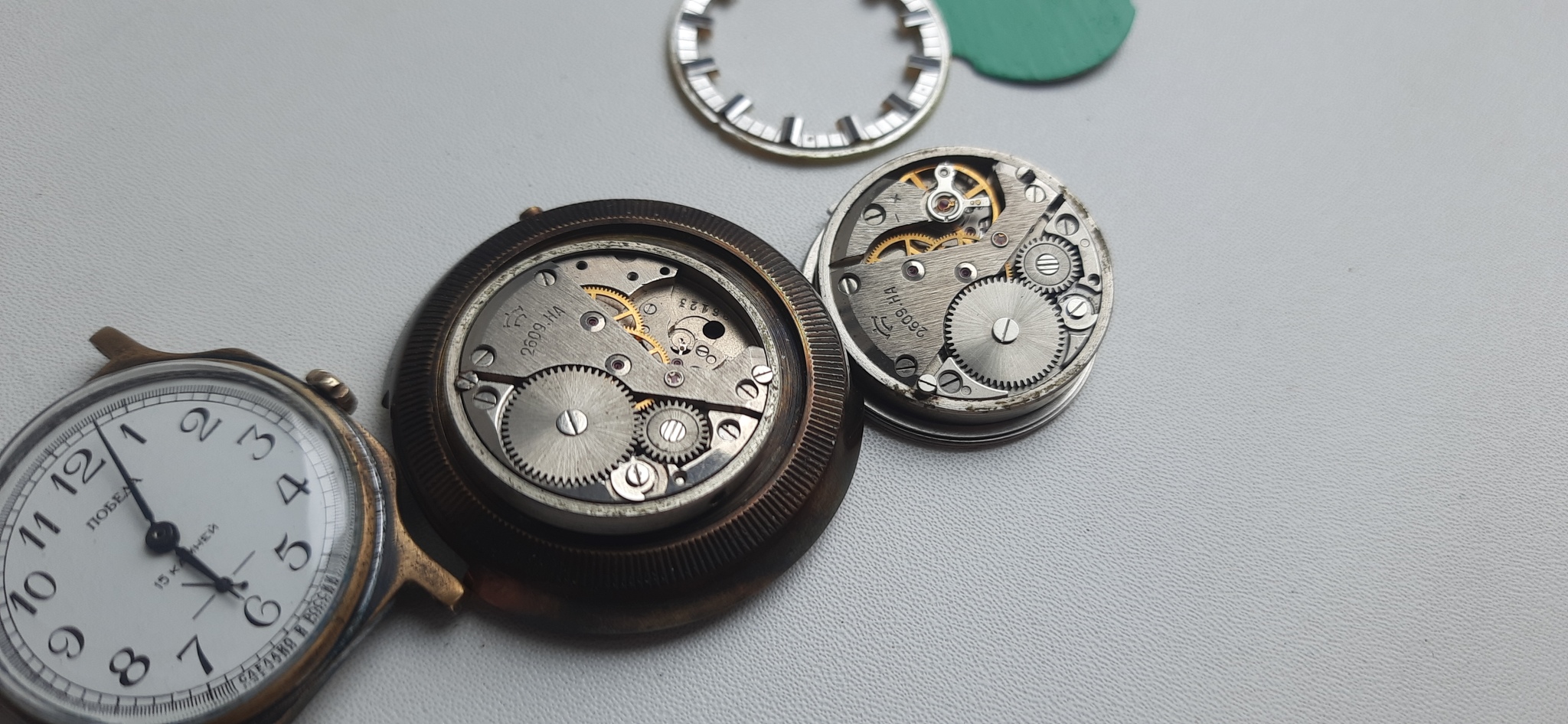Ах да помню просьбу , на Победе надо привести в порядок ремонтуар , так как заказчику нет возможности с комфортом заводить часы , но сами часы рабочие, а вторые часы Ракета из 2 механизмов собрать один. Ну это не трудно погнали разбирать Ракету.