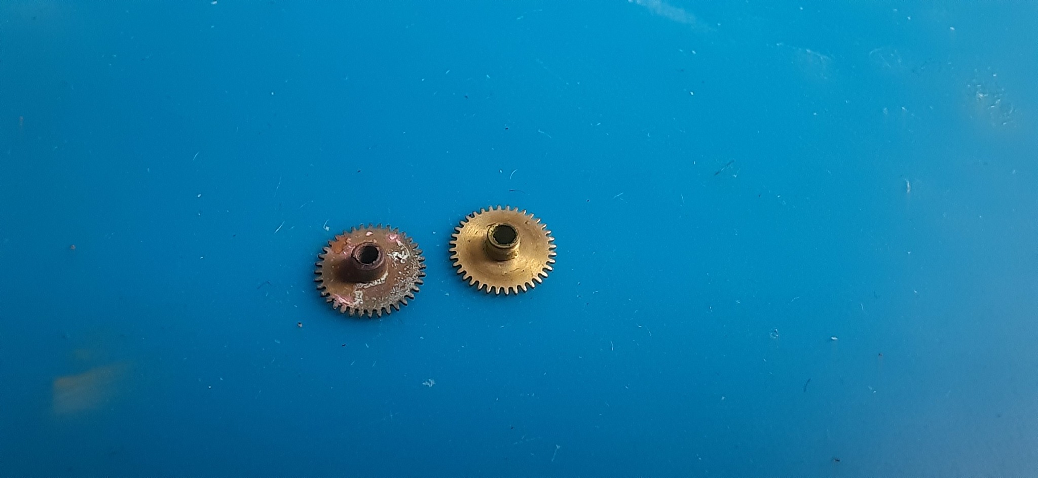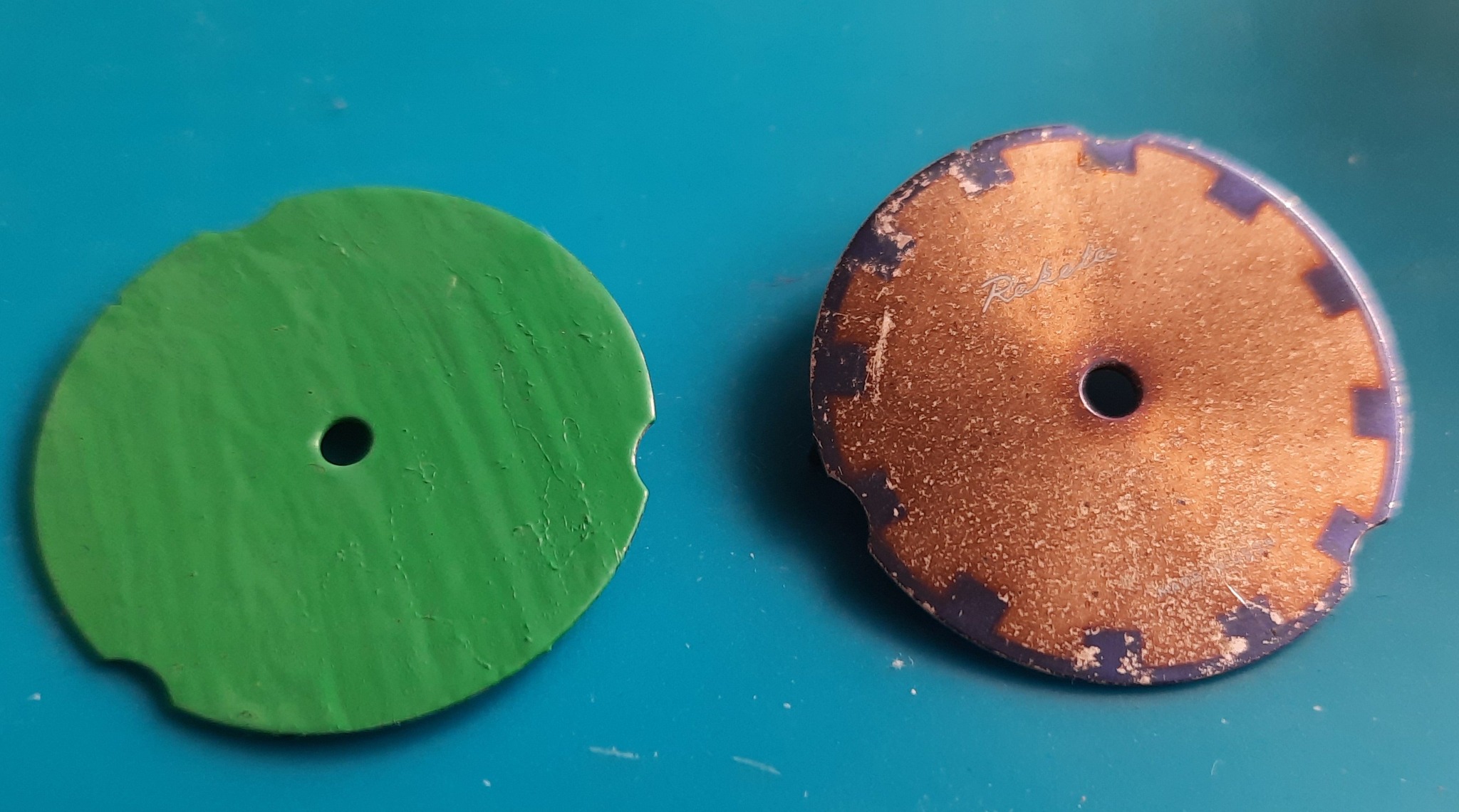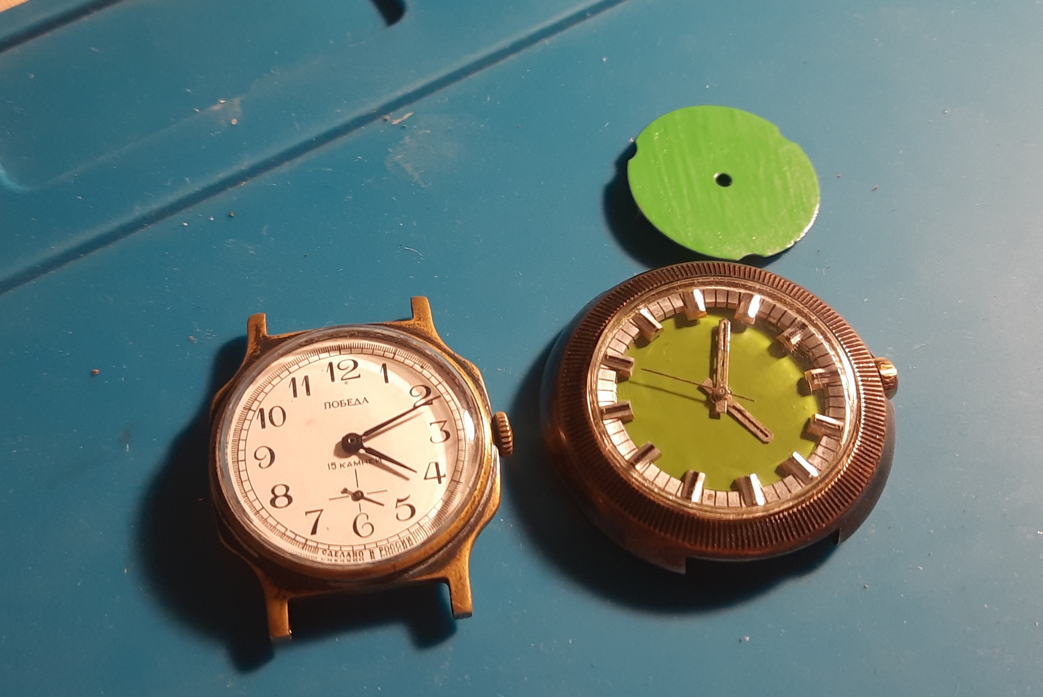 А вот дальше идет 2 циферблата , один покрашен в зеленый цвет , это не заводская краска и заказчик хочет именно этот циферблат , на мои предложение поставить другой пошел в отказ. Мы должны выполнять то что просит клиент а не создавать дискомфорт заказчику. При этом сказано было пикабушнику то что в его любимом цвете самодельном сломана ножка, дан был ответ : Заклеить но нужен этот же циферблат. Ну что ж покажу что было.