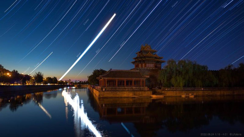 Изображение создано с помощью таймлапса, собранного из последовательных снимков, создаваемых почти три часа с камеры, установленной на штативе рядом с Запретным городом в Пекине, Китай, 24 июня.