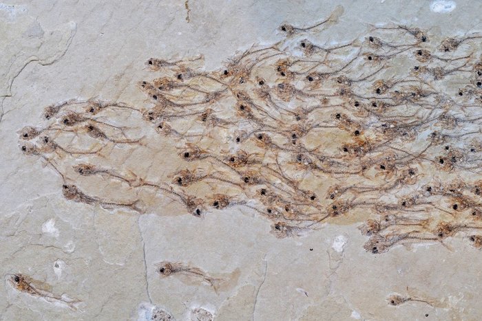 50-миллионолетняя плита с отпечатками стаи рыбок, плывущих в одном направлении. Окаменелость проливает свет на наличие стайного движения у различных групп живых существ.