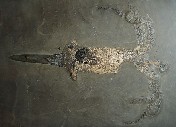 Отпечаток кальмара Plesioteuthis sp. из знаменитых золенгофенских сланцев позднеюрского возраста (~150 млн лет), Золенгофен, Германия.
