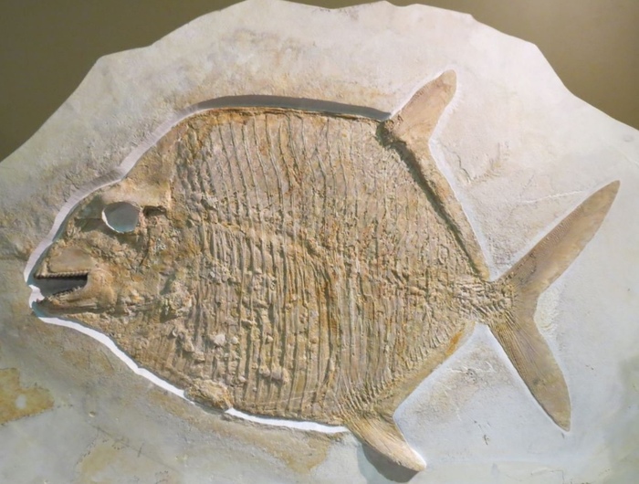 Отпечаток юрской рыбы под названием гиродус (Gyrodus), которая имела полный рот плоских зубов, идеально приспособленных для дробления раковин аммонитов и ракообразных.