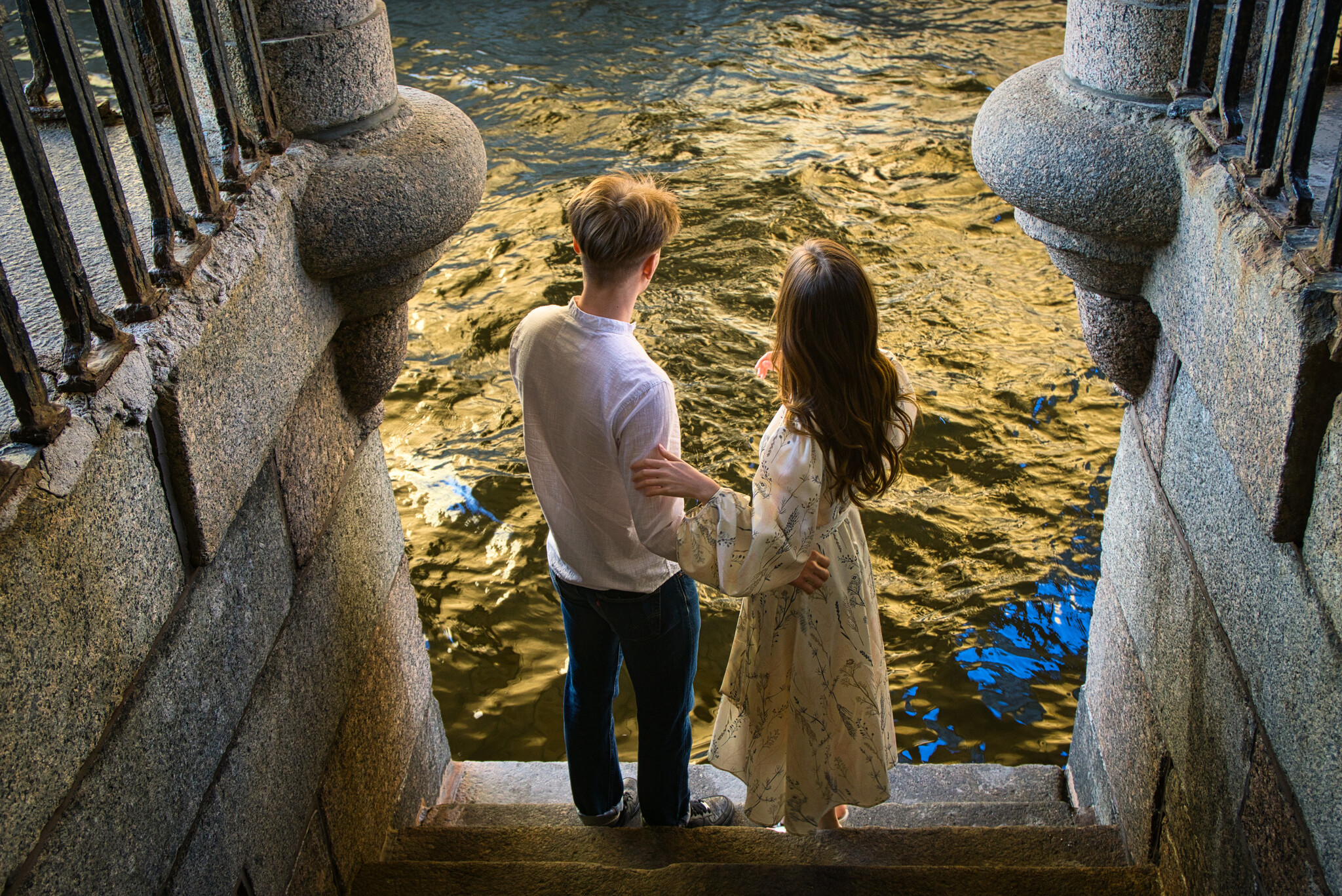 В мае-июне, когда садится солнце, оно заглядывает под Эрмитажный мост на Дворцовой набережной. И возникает вот такой эффект -- смешивается свет лучей, отсвет отражения здания Зимнего Дворца Петра, да ещё и гранитные набережные придают свой оттенок. А фото сделано в 2023 году. Два года на этом месте ремонт, надеюсь его когда-то закончат.