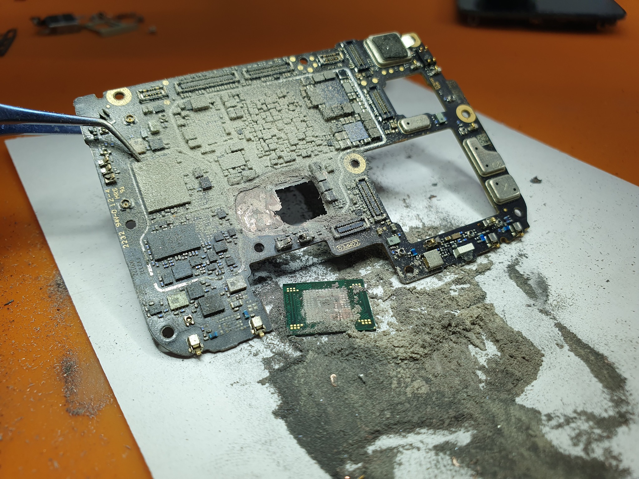На полностью рабочем доноре разделение происходит уже со стороны процессора с подачей 500 градусов горячего воздуха, убивая всё: проц, память и контроллеры. Важно сохранить в хорошем состоянии тонкую плату с сетями и коннекторами, которая будет садиться уже на утопленную для восстановления данных.