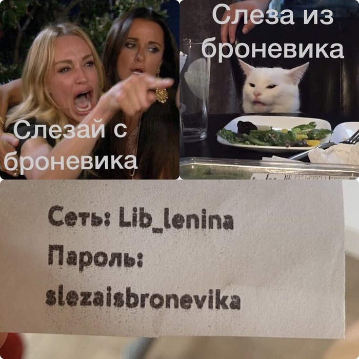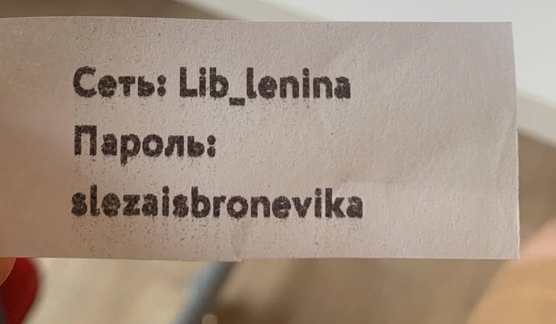Новый пароль библиотеки — slezaisbronevika. Люди читают его по-разному: «Слезай с броневика» и «Слеза из броневика». Конечно, этот спор оформили как мем.