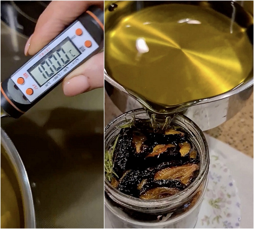 Растительное масло. Тут, конечно, дело вкуса, но вот нам очень нравится из виноградных косточек которое. Раскаляем масло до 100 градусов и заливаем им набитые сливой и сопутствующим баночки. Подождите немного, пока масло протечет и добавьте. Цель - добиться того, что содержимое банок было покрыто маслом. Лучше залить под самый верх. Под крышку.