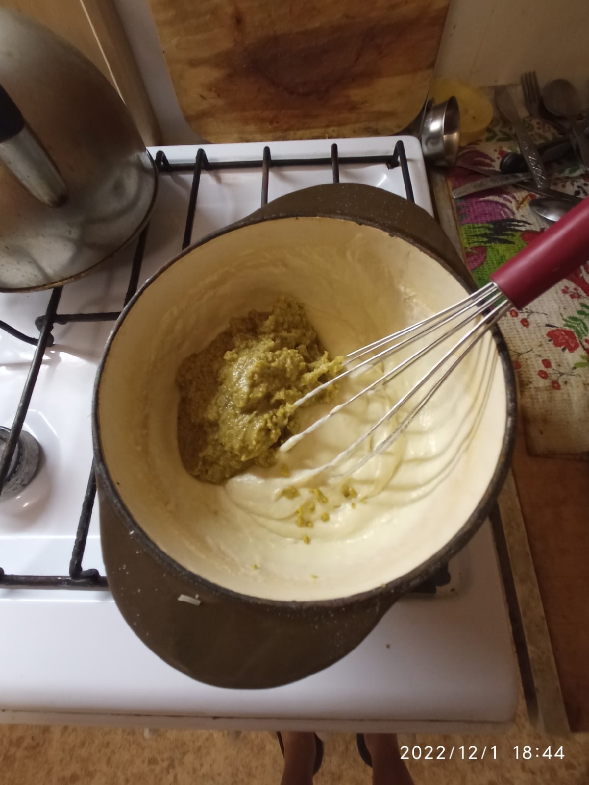 Потихоньку засыпаем муку, постоянно помешивая, чтобы не образовались комочки.