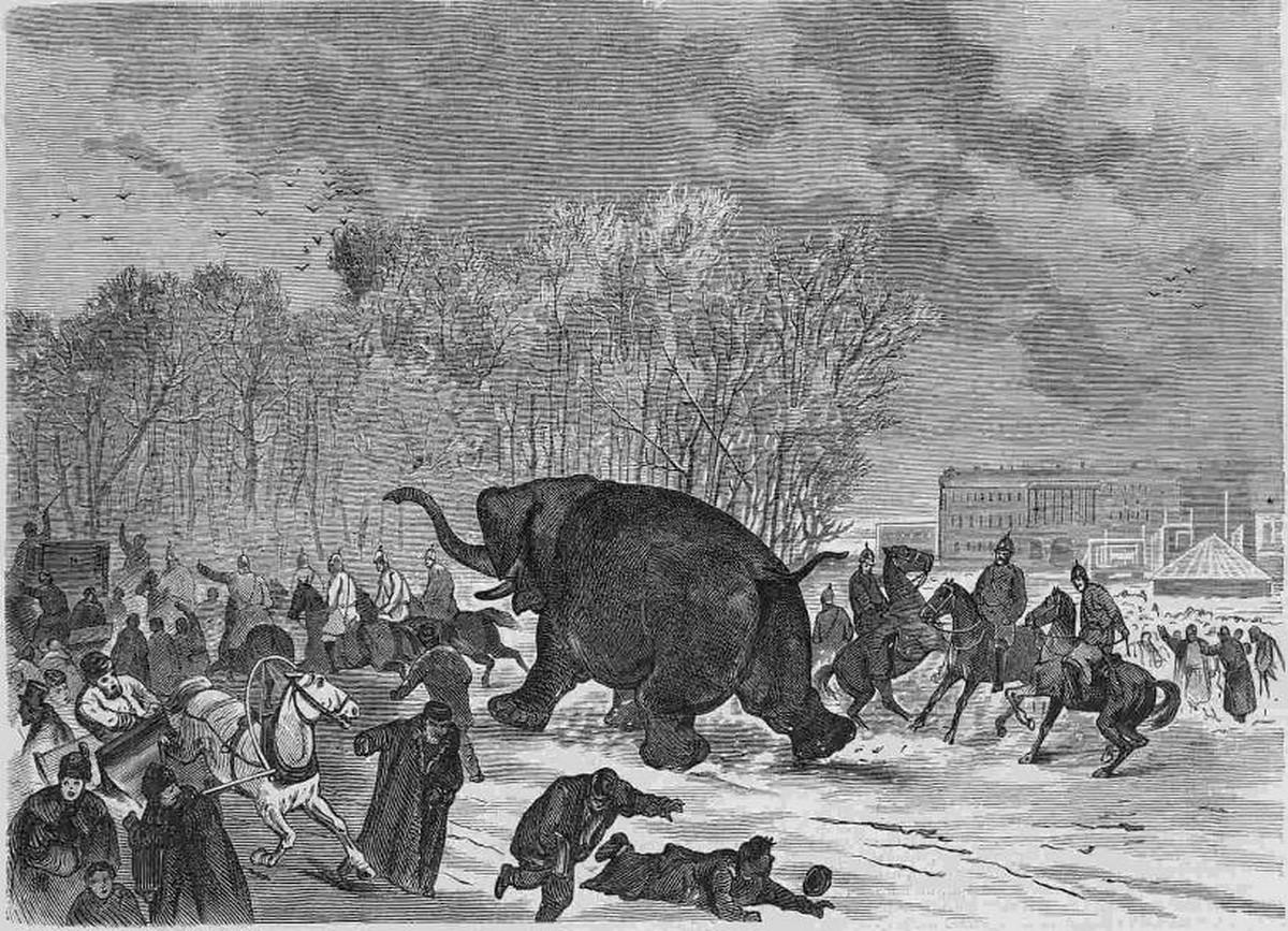 Может, правда, на то были и объективные причины, поскольку слоны в столице вели себя кое-как — частенько вырывались из загонов, в пьяном виде ломали будки квартальных, норовили упасть с мостов… Один из них, «осердясь о самках пошёл через сад и изломал деревянную изгородь, и прошёл на Васильевский остров, и там изломал чухонскую деревню». Короче, сами виноваты.