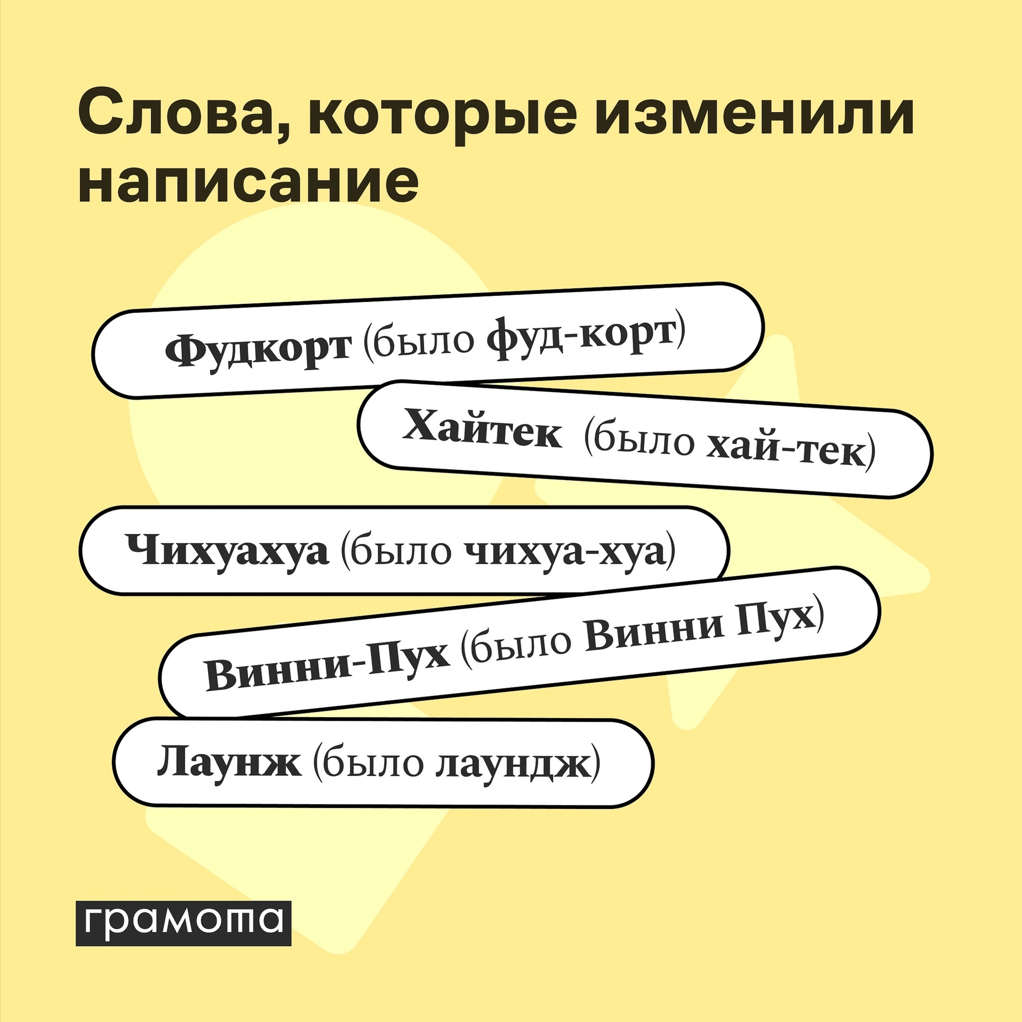 16 graf4ikov Лига грамотности Слова, изменившие своё написание1 4 месяца назад Источник: Грамота.ру Грамотару ВКонтакте (ссылка) Русский язык Грамотность Изменения Написание Слова Лингвистика Филология Фудкорт Чихуахуа Винни-Пух Лаунж Россия 6 2 Ещё 0