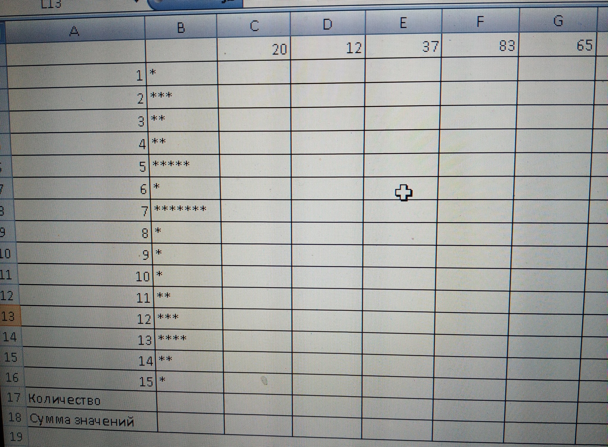 Сам не смог найти, прошу помощи. Сформулировал не грамотно, но как смог, прошу не пинать).В exel есть ячейки заполненные данными, в нашем случае это разное количество звездочек в ячейке. Верхняя строка заполнена числовыми данными, каждая цифра соответствует одной звездочке. Как сделать, чтобы автоматически в нижнюю строку считалось количество звездочек в столбце и в следующую строку сумма их числовых значений.