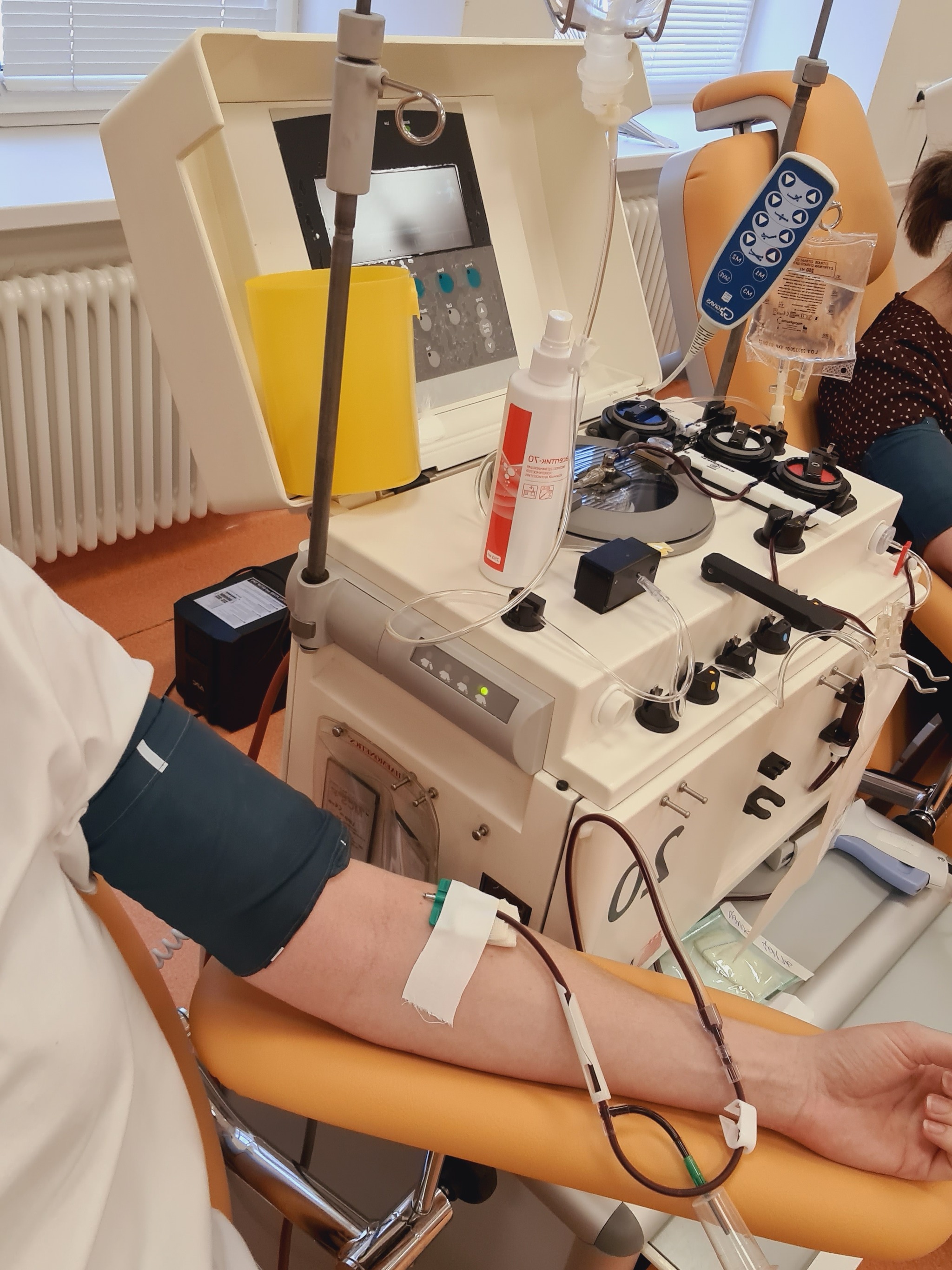 Всё начиналось вполне по плану. Села в кресло с лёгким наклоном как в авто, справа от меня стоял аппарат, прокололи правую руку (только потом увидела, что сидящая справа девушка с аппаратом под правую руку сдаёт из левой). Рассказали, что процедура будет состоять из трёх этапов: забираем кровь — возвращаем обратно — и так трижды. Сначала берут несколько пробирок с кровью на анализы. Работаем кулачком, когда манжета на руке надувается. Изначально мне объяснили, что диоды (зелёный, оранжевый, красный и оранжевый) показывают этапы. Когда последний оранжевый диод загорается и манжета сдута, то кулаком работать не надо - идёт залив крови обратно в тело). А потом я сама вычислила, что если оранжевый или красный, то я плохо качаю. А если начинаю хорошо качать, то зелёный диод загорается.