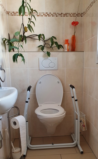 Еще никогда не задумывалась как сесть и встать с унитаза на одной ноге. Практически нереально, но не для качков со здоровыми коленями, конечно. Обставила унитаз табуретками- руками упираться. Душ принимаю сидя на табуретке, перед этим нужно приклеить специальный пластырь на бедро.