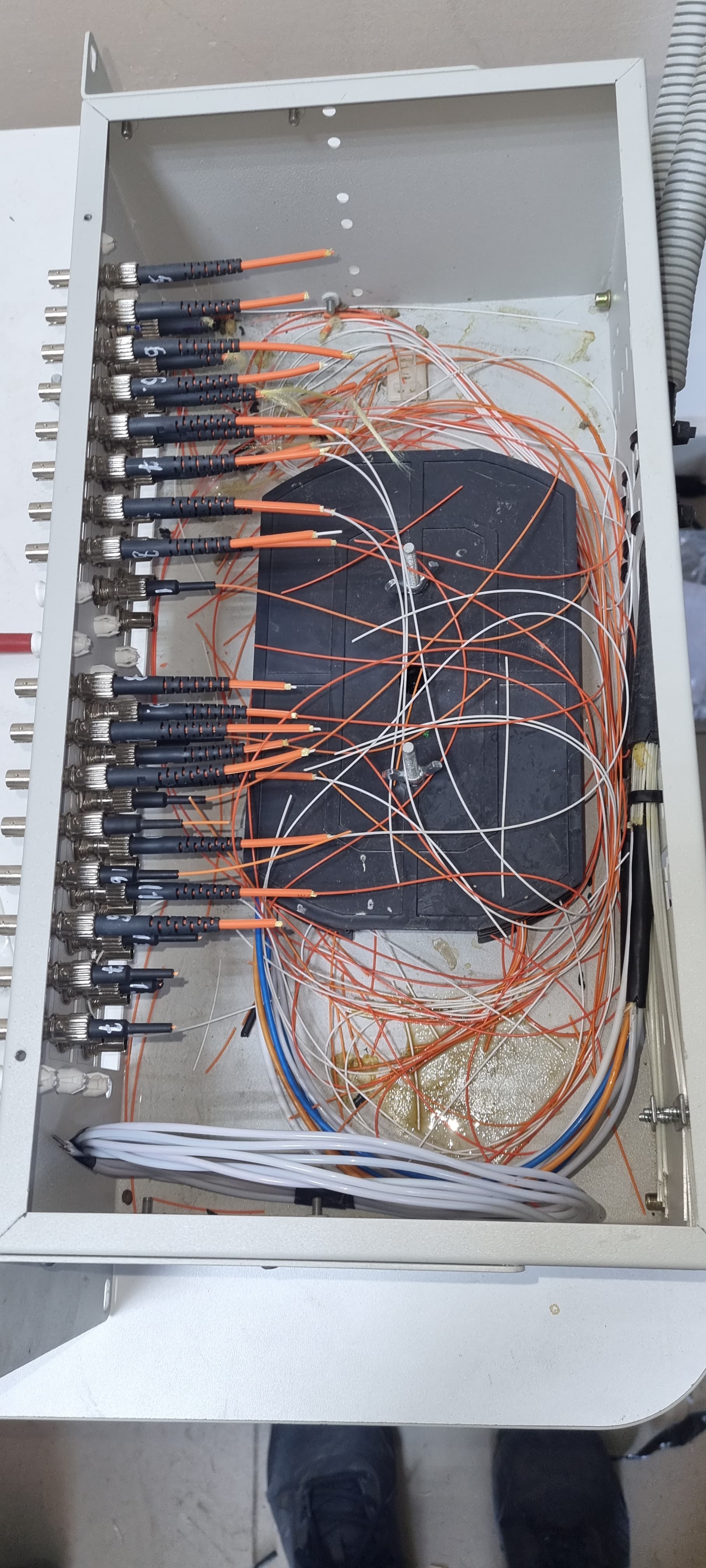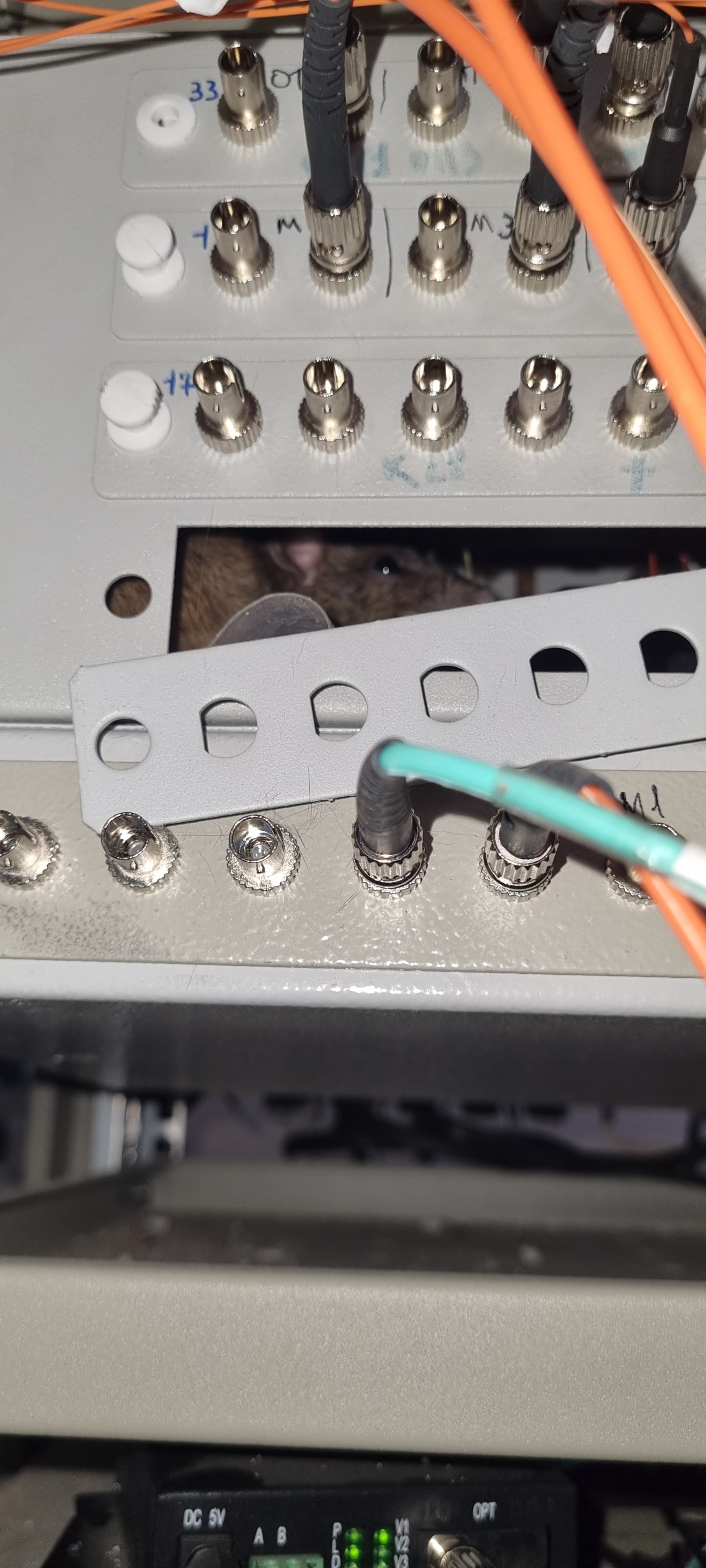 Работаю техником по обслуживанию ИТСО. И вот в декабре прошлого года приходит заявка, что не работает СТН(видеонаблюдение), выезжаю, осматриваю и вижу что нет обмена по оптическим линиям. Разбираю оптический кросс, вижу массу повреждённых волокн и предположительно продукты жизнедеятельности неких грызунов. Далее бюрократия, споры с владельцами оборудования("Какие крысы?" "Нет у нас таких!!!" "Вы ошибаетесь!!!") и день восстановления. Кросс залил спиртом(так посоветовали) и с чувством выполненного долга ретировался восвояси.