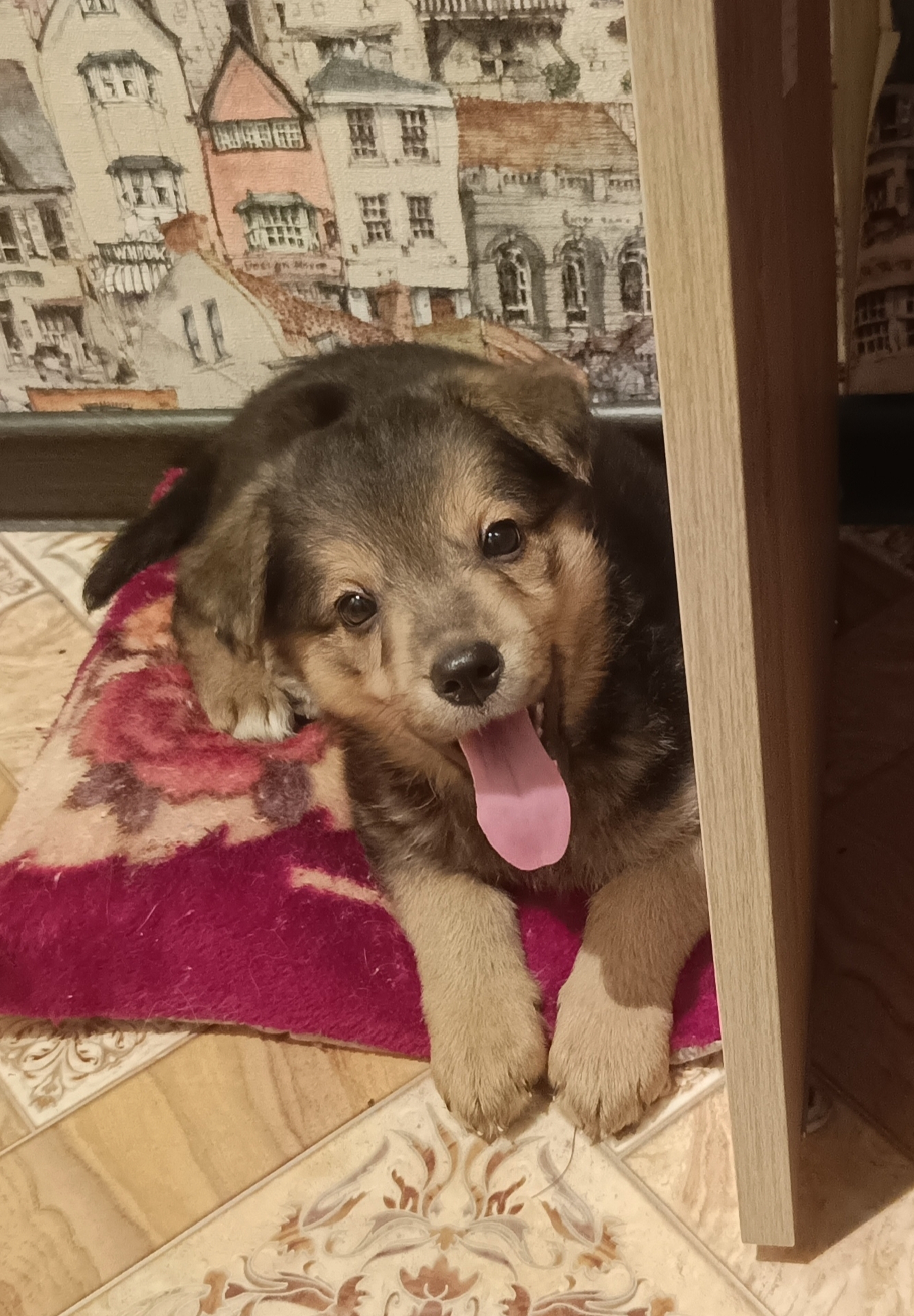 В середине февраля услышали какие-то непонятные звуки за дверью, но особо внимания не обратили. Минут через пять звук усилился и стало понятно, что в подъезде кто-то скулит. Я подождала ещё пару минут в надежде, что-то выйдут соседи, но скулёж нарастал и мне пришлось открыть дверь. Там я увидела малюсенького дрожащего щенка, не долго думая, занесла его домой.