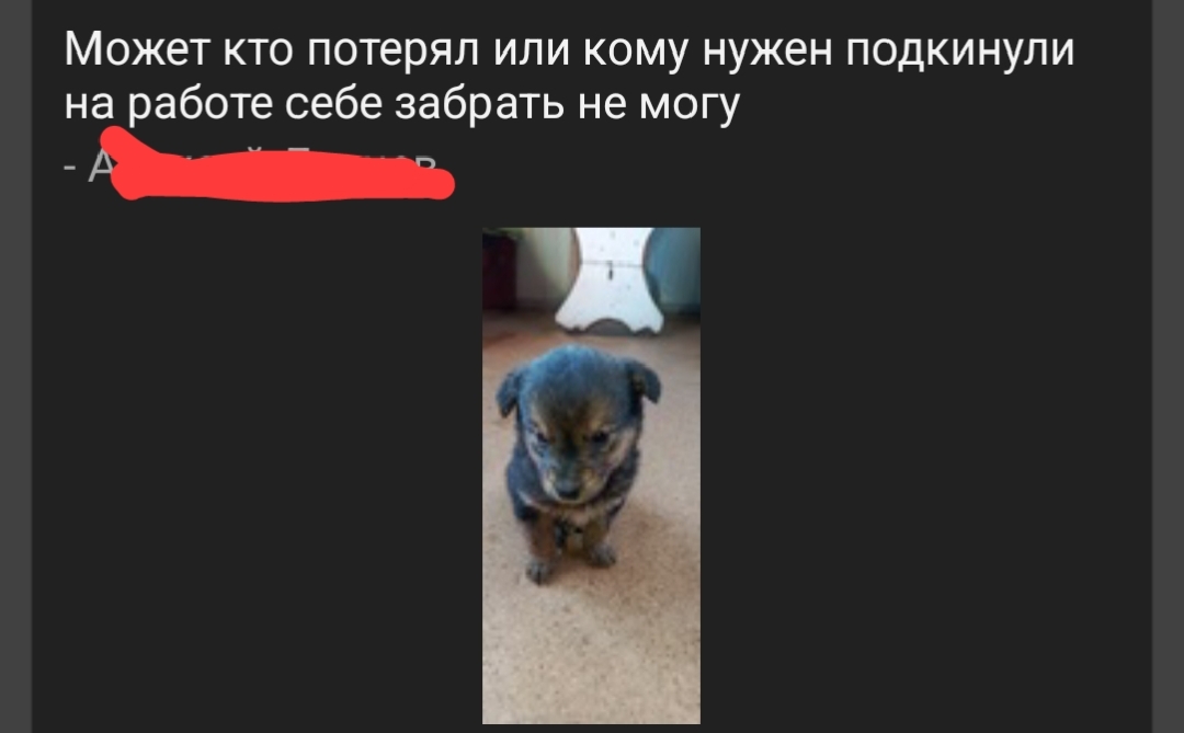 Мы затарились едой, пелёнками и стали публиковать в местном Подслушано посты о пристройстве. В том же Подслушано я нашла просьбу о пристройстве от какого-то парня, именно в тот день щенок оказался в нашем подъезде.