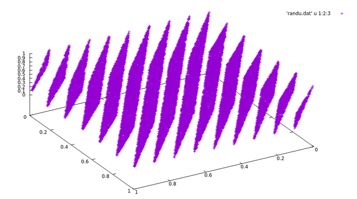 Сгенерированные числа могут быть статистически зависимыми. Это особенно заметно при использовании LCG для многомерного моделирования, где точки могут выстраиваться в определённые шаблоны или линии, а не распределяться равномерно.