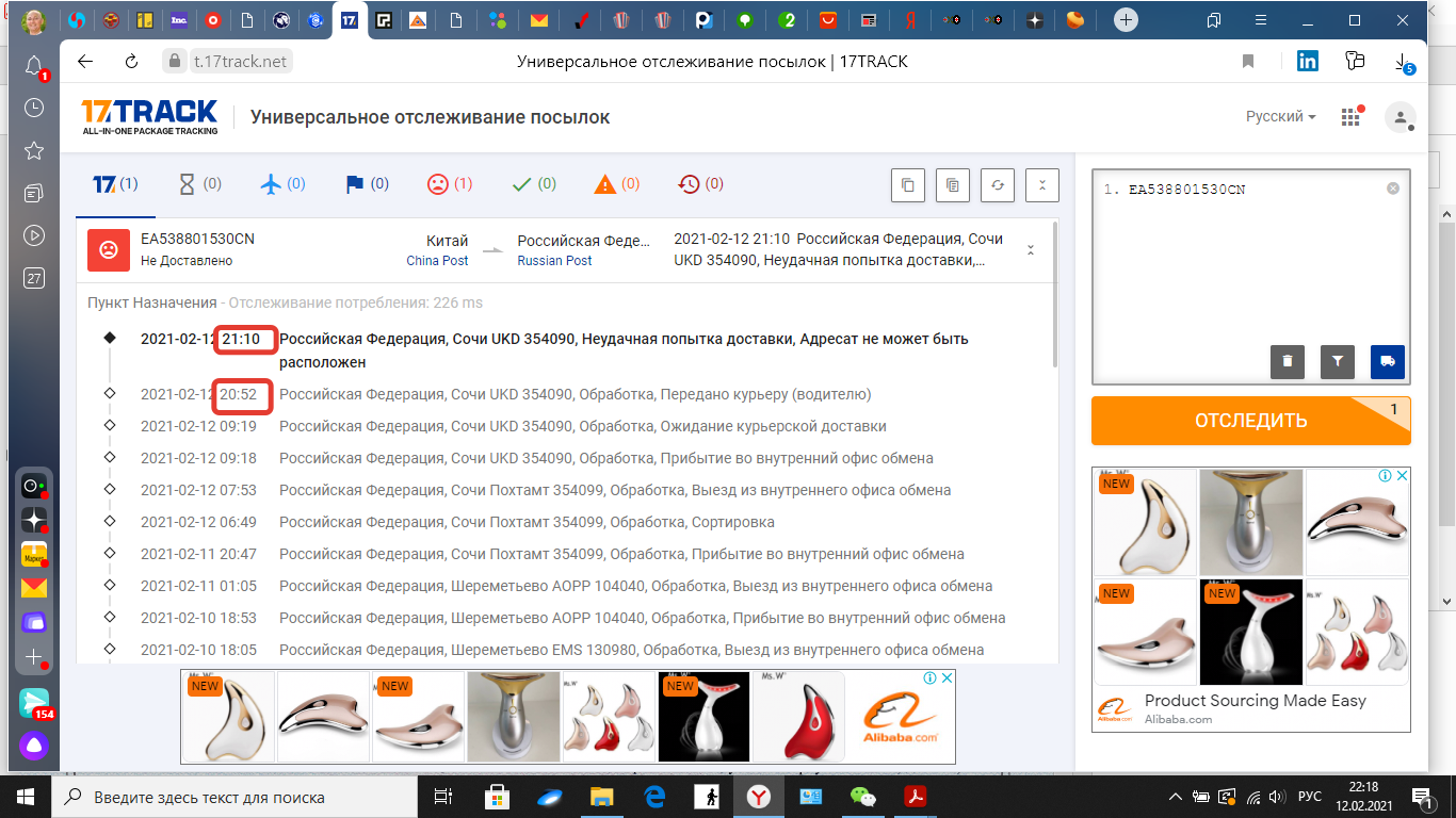 Судя по этой информации, в нерабочее время около девяти вечера курьер пытался доставить посылку и через 18 минут его постигла неудача. Однако весь этот день, включая указанные 18 минут я находился дома и на телефоне, это связано с работой и легко технически подтверждаемо.