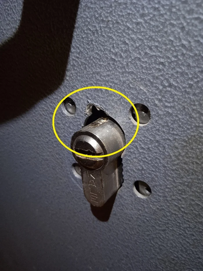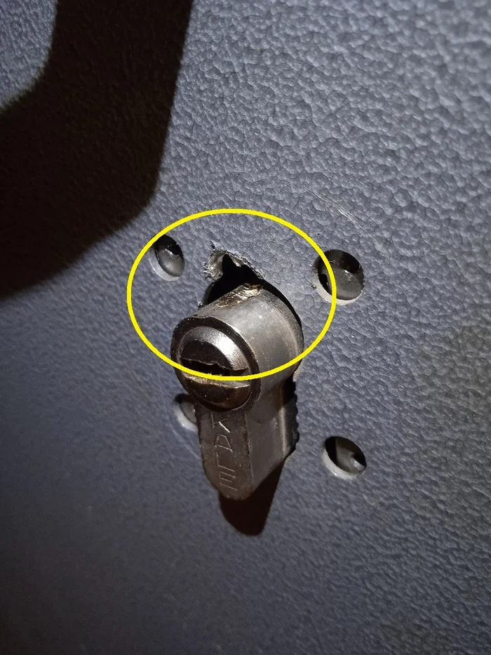 Кстати, на этом фото отчетливо видно что цилиндр долго и упорно пытались провернуть плоской отверткой. Видны сильные замятия на кромке замочной скважины.