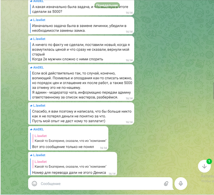 Если бы клиентка написала мне или другим админам в процессе работы мастера, то ничего этого бы не было. Но за попытку развода мы бы все равно удалили мастера из списка.
