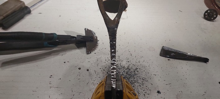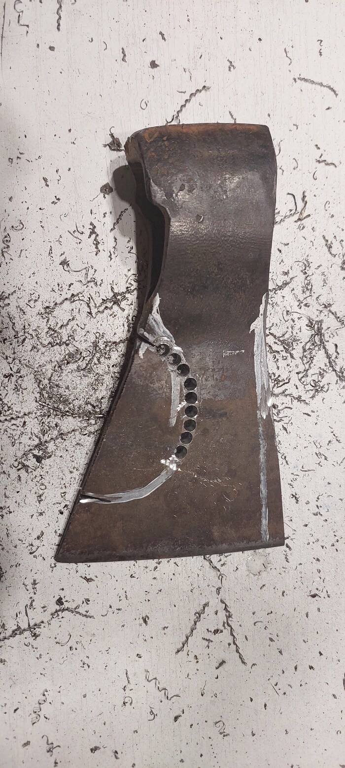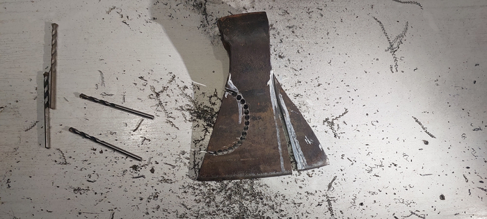 Сделал приблизительную разметку формы топора, отрезал болгаркой часть и начал сверлить отверстия по разметке.