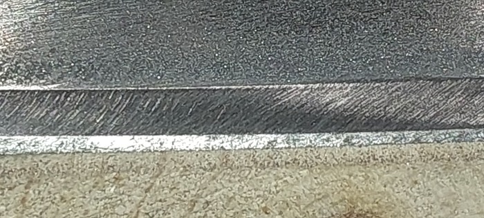 В целом все получилось. Ширина спусков 6мм, режущяя кромка попала в центр толщины клинка.