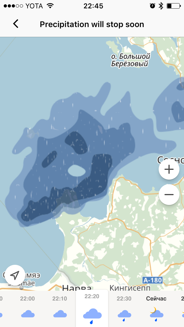 GrigoriiGromov Смайлик из дождика 8 лет назад Недавно вышло обновление для приложения Яндекс.Погода, теперь видна карта осадков. Мне очень нравится наблюдать в реальном времени, когда закончится дождь и куда он плывёт) [моё] Длиннопост Яндекс Погода Смайл