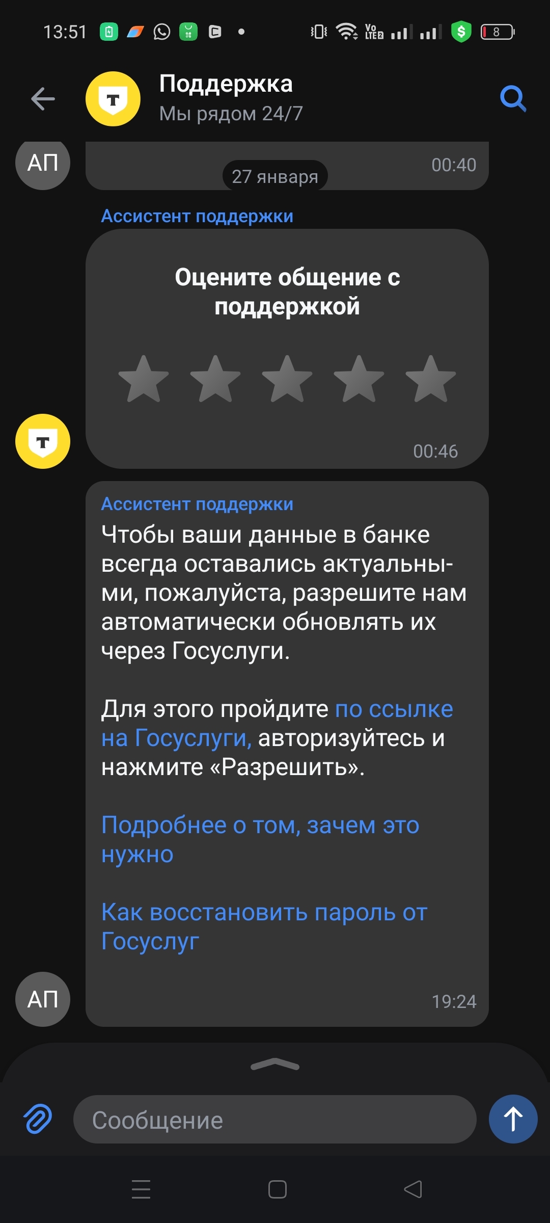 Звоним в поддержку, где механический голос нас распрашивает о проблеме и безапелляционно направляет нам в чат приложения инструкции по привязке к госуслугам, для "автоматической актуализации данных".