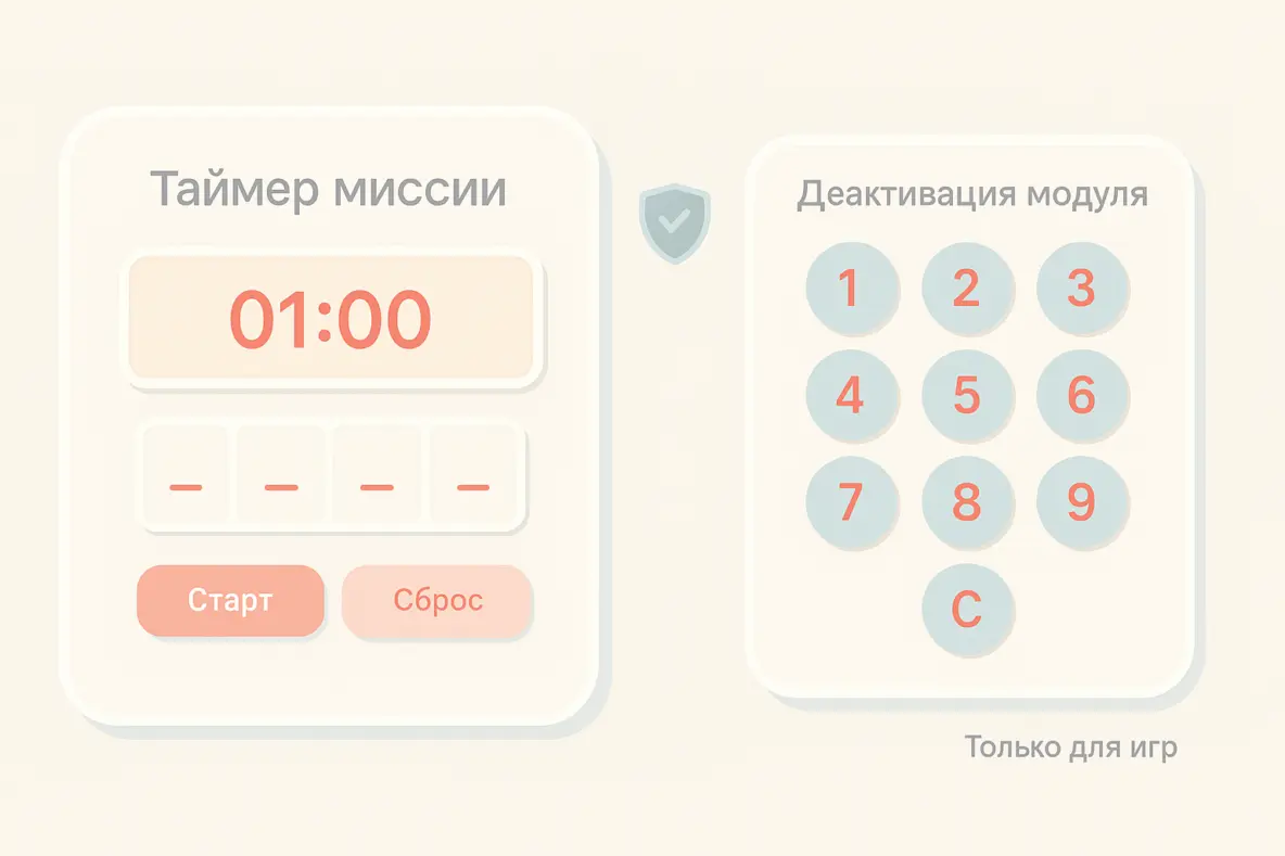 Сценарии на смартфоне — это быстро: настроил время, задал длину кода, выбрал тему и звучки — погнали. Экран яркий, подсказки понятные, перезапуск — секунда. Оффлайн-режим для площадок без связи — must have.