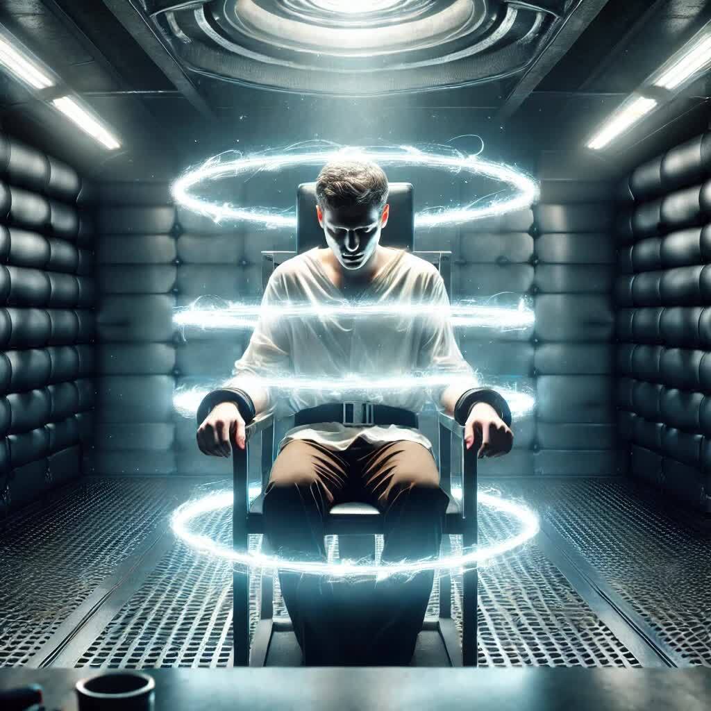 Блит включил запись и вывел её на главный экран. Требовался более широкий обзор. Камера для допросов была тускло освещена и редко убиралась. Человек, судя по всему мужчина, был крепко привязан к холодному металлическому сиденью фотонными оковами. Похоже, дознаватель уже успел поработать над солдатом, если судить по открытым ранам.