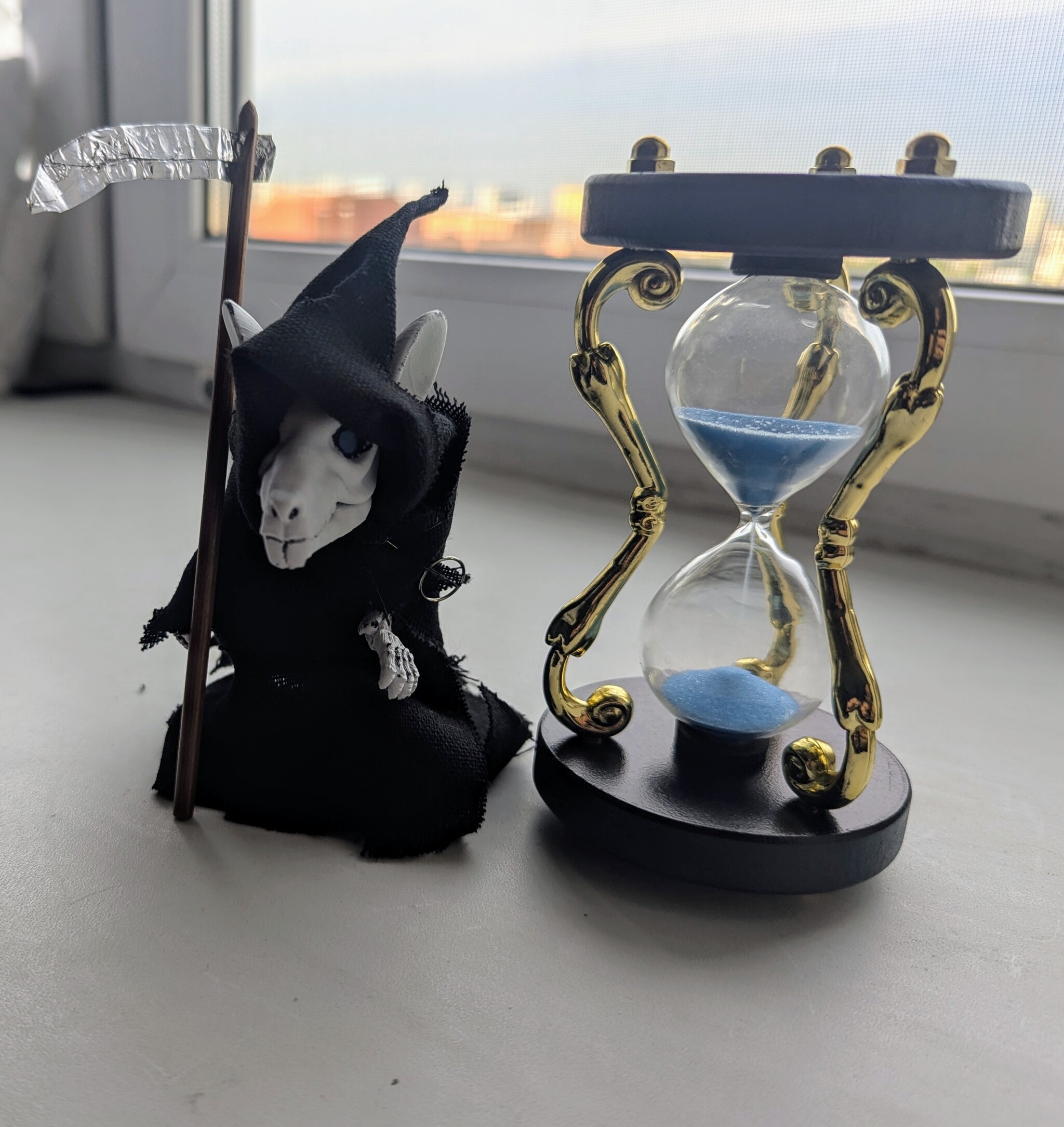Добавил накидку на плечи, прикрыл руки. Думаю сделать подставку для Крыса и часов, чтобы получилось композиция Надо ещё лезвие на косе переделать, заколку заменить на "брошь", а также планировал глаза сделать светящимися