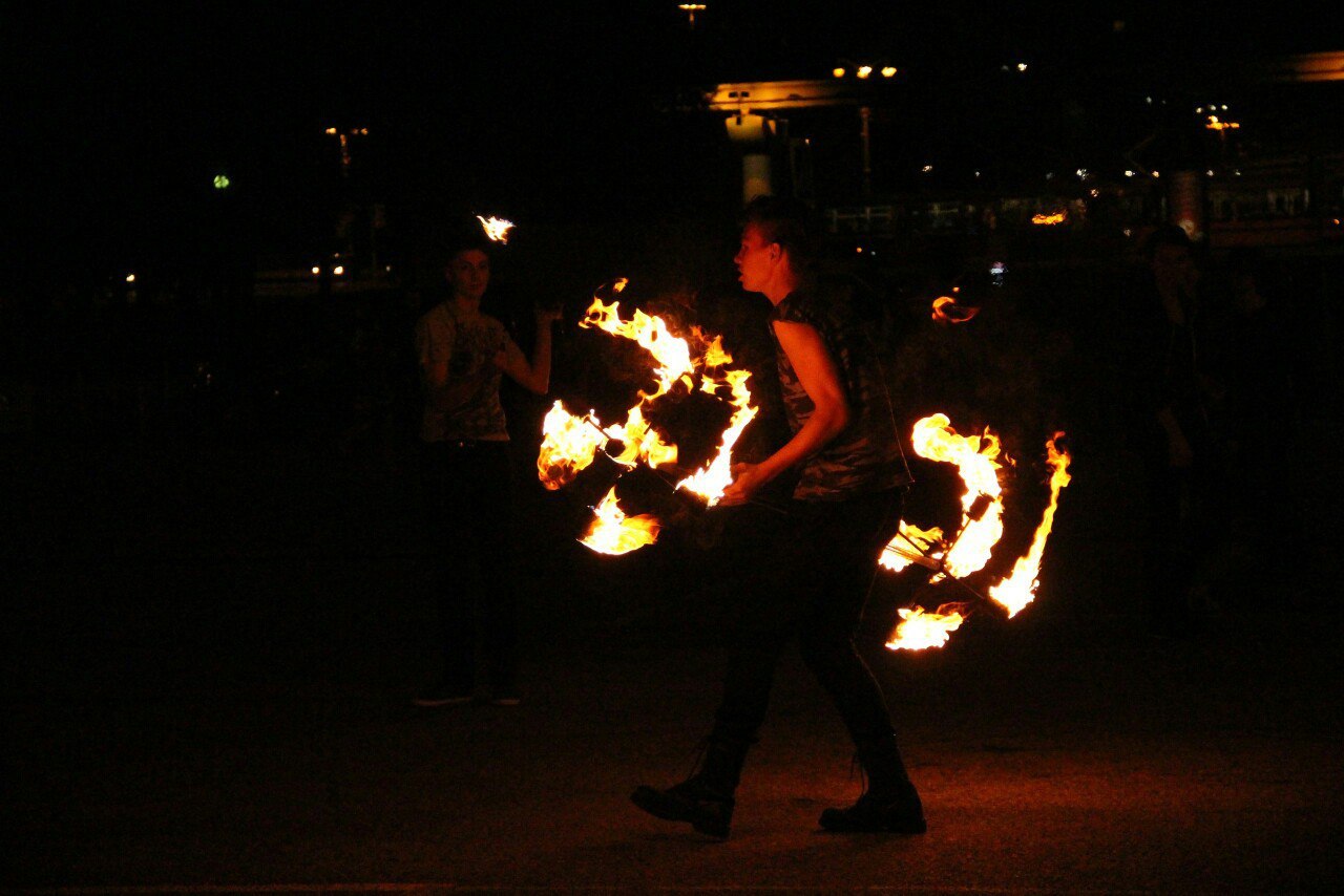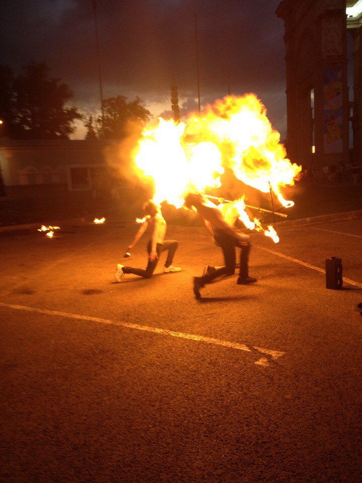Дело было так: это был самый обычный день выступления на ВДНХ. У нас была программа бриз с драгонстаффа. Из-за того что я набрал слишком много парафина в рот бриз затянулся и выдал очень большую температу, что чуть не обожгло спину стаффера. Реакция последовала незамедлительно - стаффер положил драгон, взял факел и начел бризить на меня пытаясь отомстить. Зрители были в восторге.