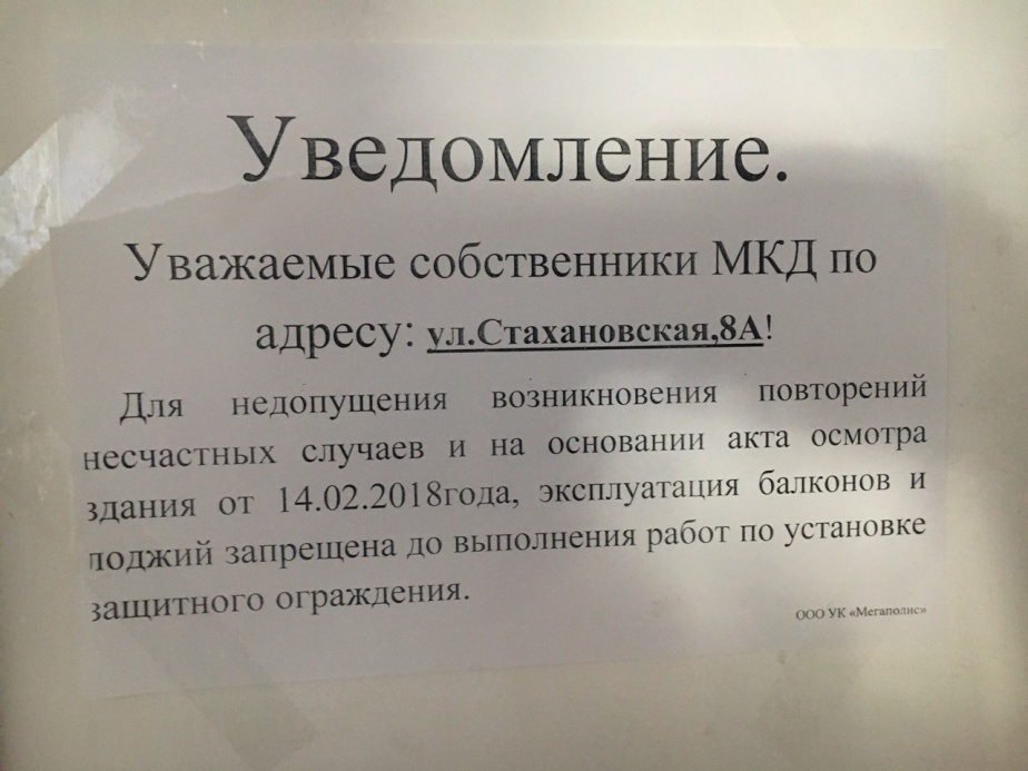 Жителям дома по улице Стахановской управляющая компания «Мегаполис» не рекомендует выходить на балконы. Соответствующие объявления размещены в каждом подъезде.