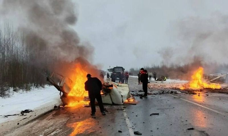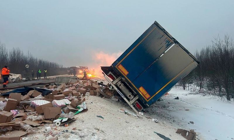 На 386-м километре трассы М8 на границе Ярославской и Вологодской областей сегодня, 16 декабря, произошло ДТП трех грузовых автомобилей. Они временно перекрыли трассу. Фуры вылетели в кювет, груз разбросало по дороге, произошло возгорание. К ликвидации привлекали сотрудников МЧС.