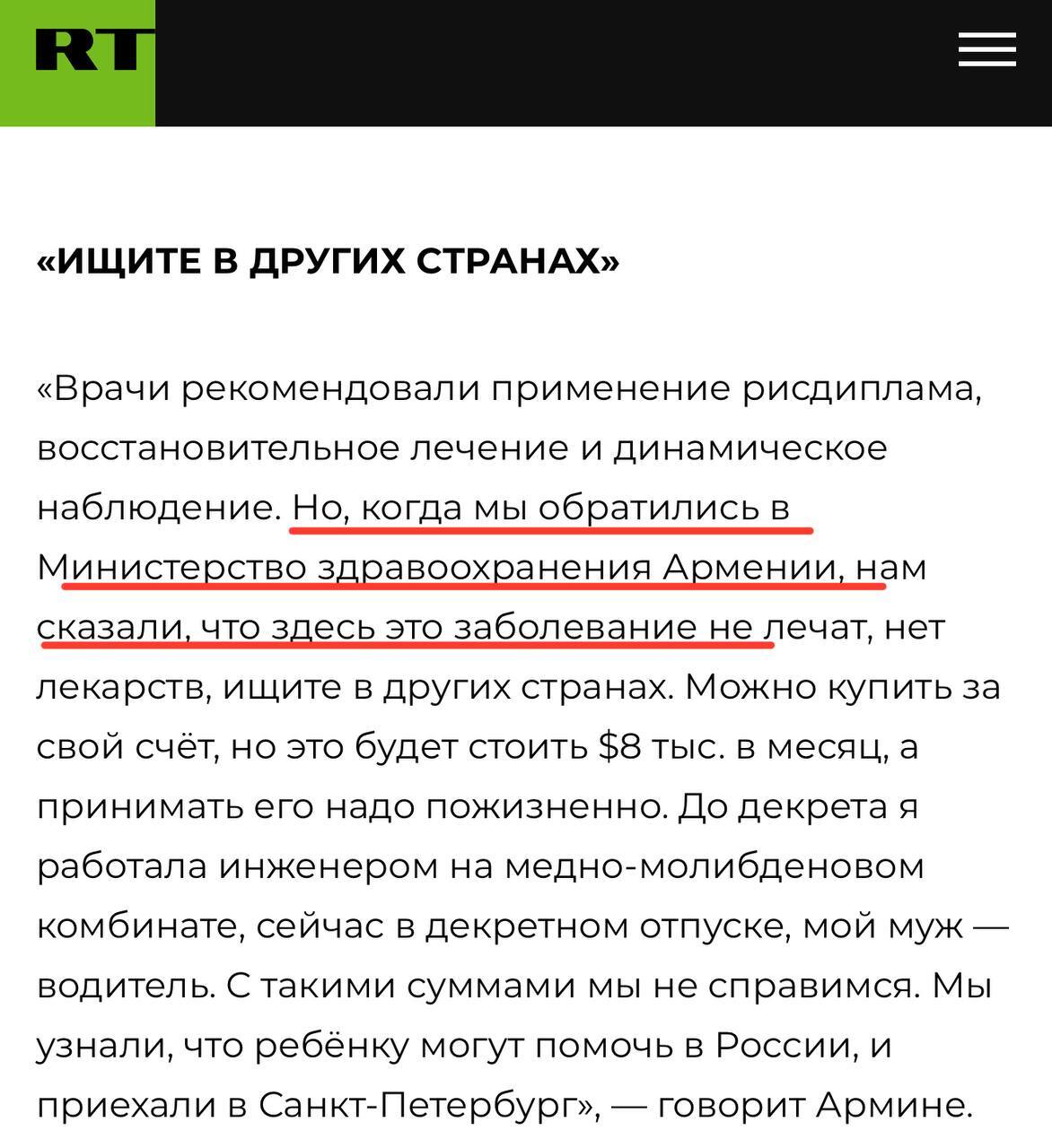 Ребёнка отказались лечить в Армении, потому что государство Армения просто не хочет это оплачивать и местный Минздрав порекомендовал поехать в Россию, которая щедрая душа и естественно вылечит всех иностранцев за счёт дефицитного бюджета воюющей страны.
