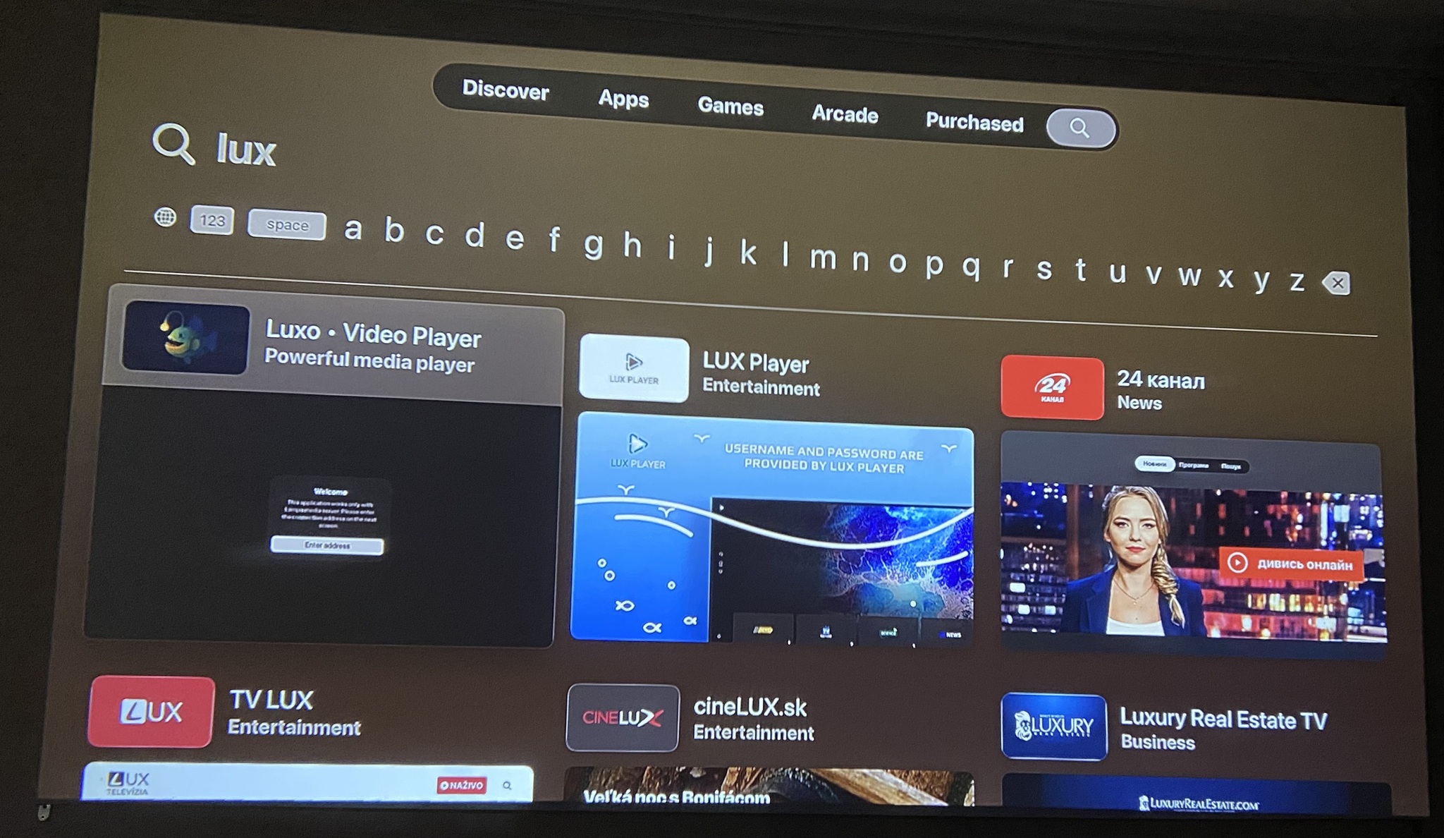 9. Теперь берём клубничный смузи и переходим к этапу настройки на Apple TV. Открываем стор и пишем lux. Выбираем приложение с рыбкой.