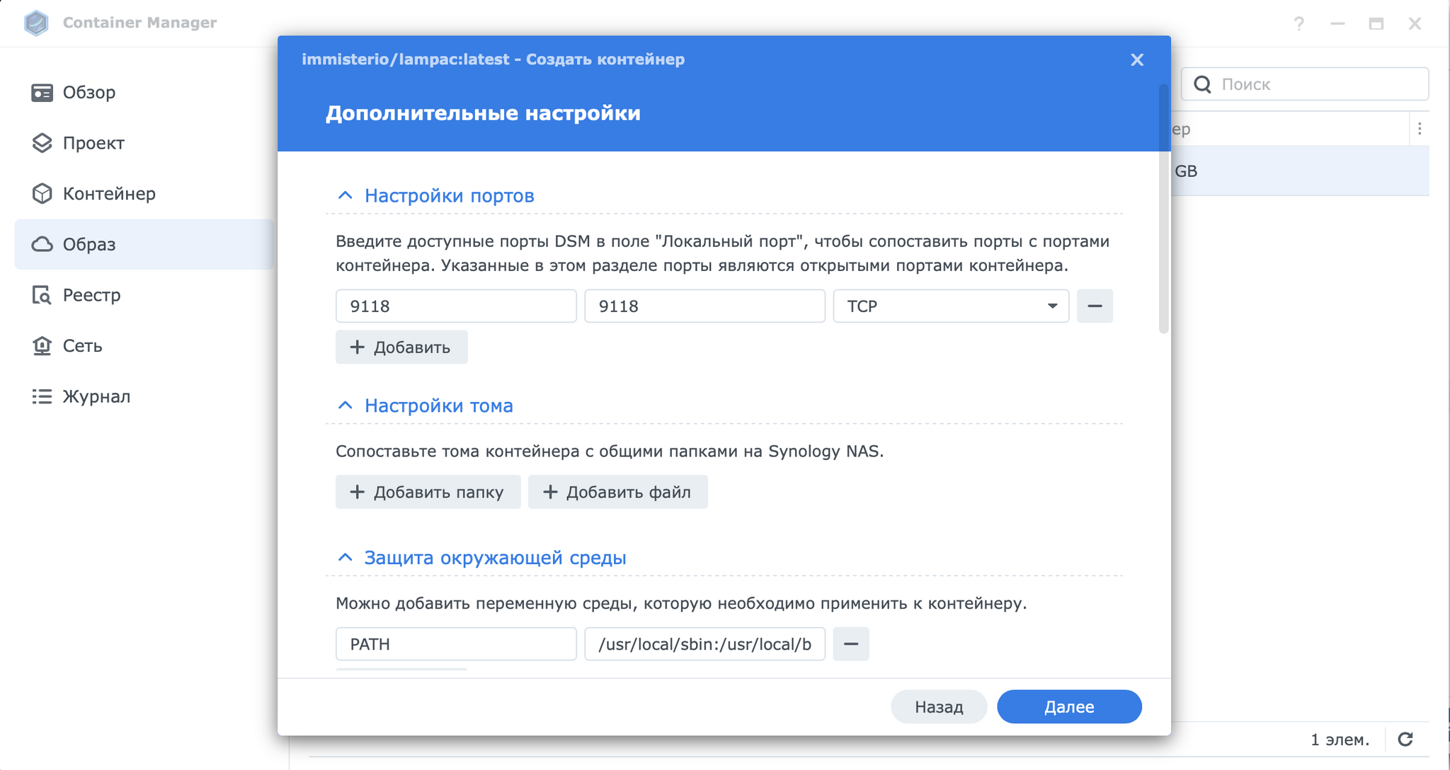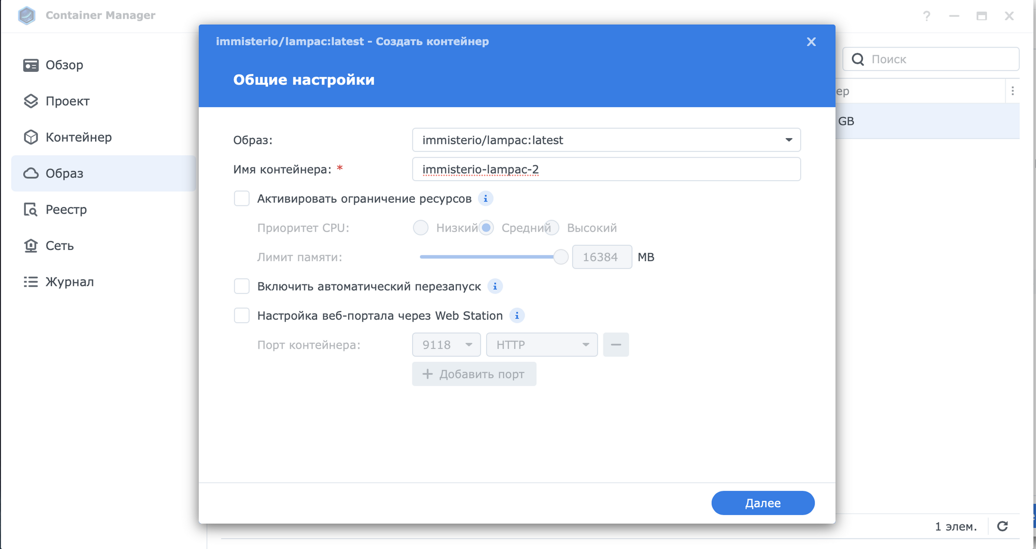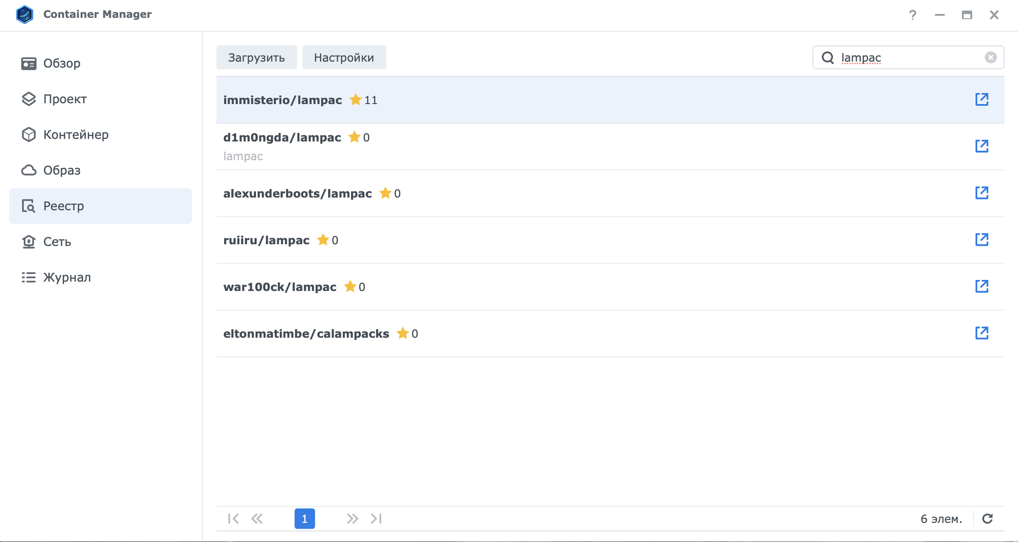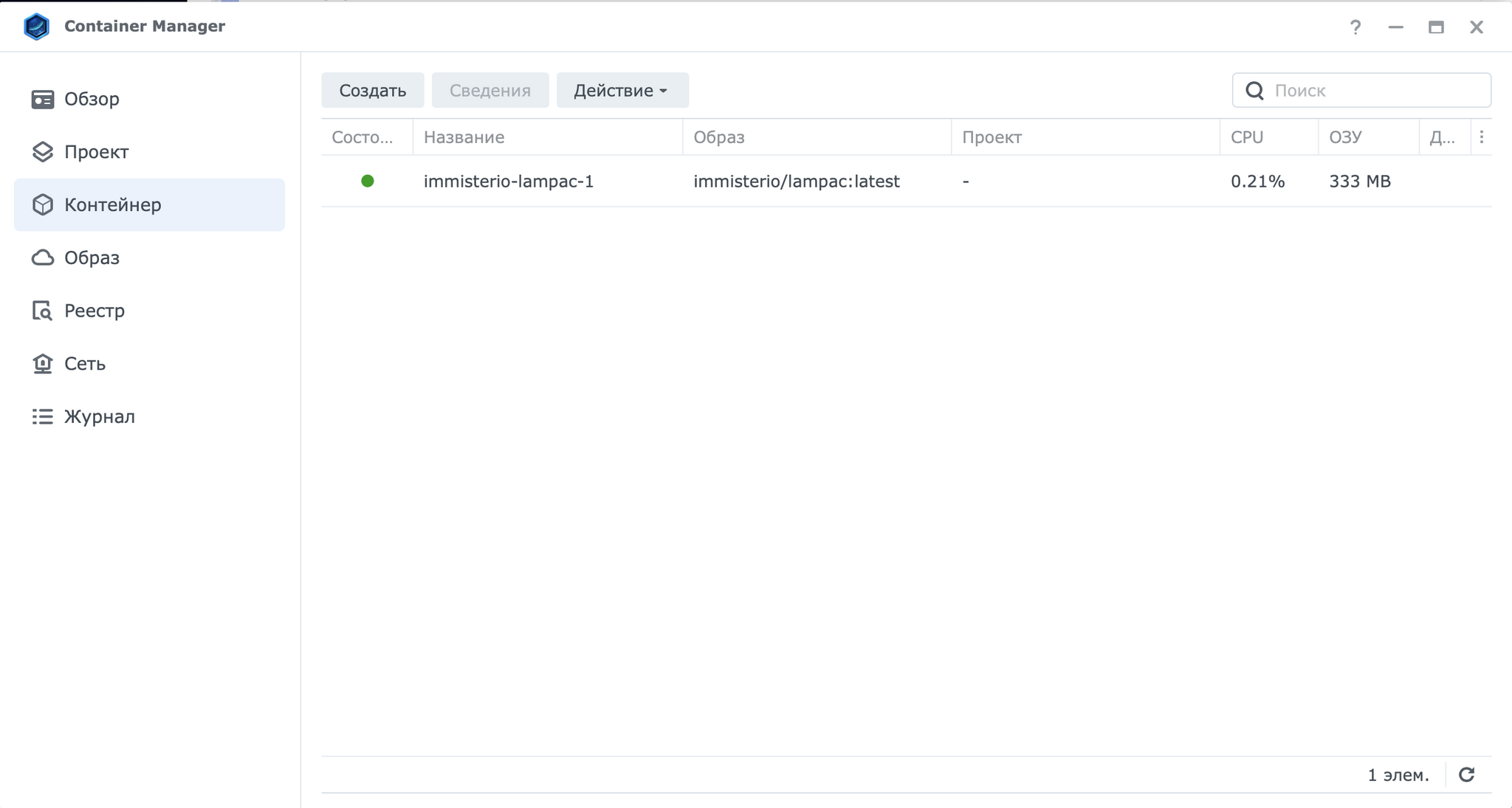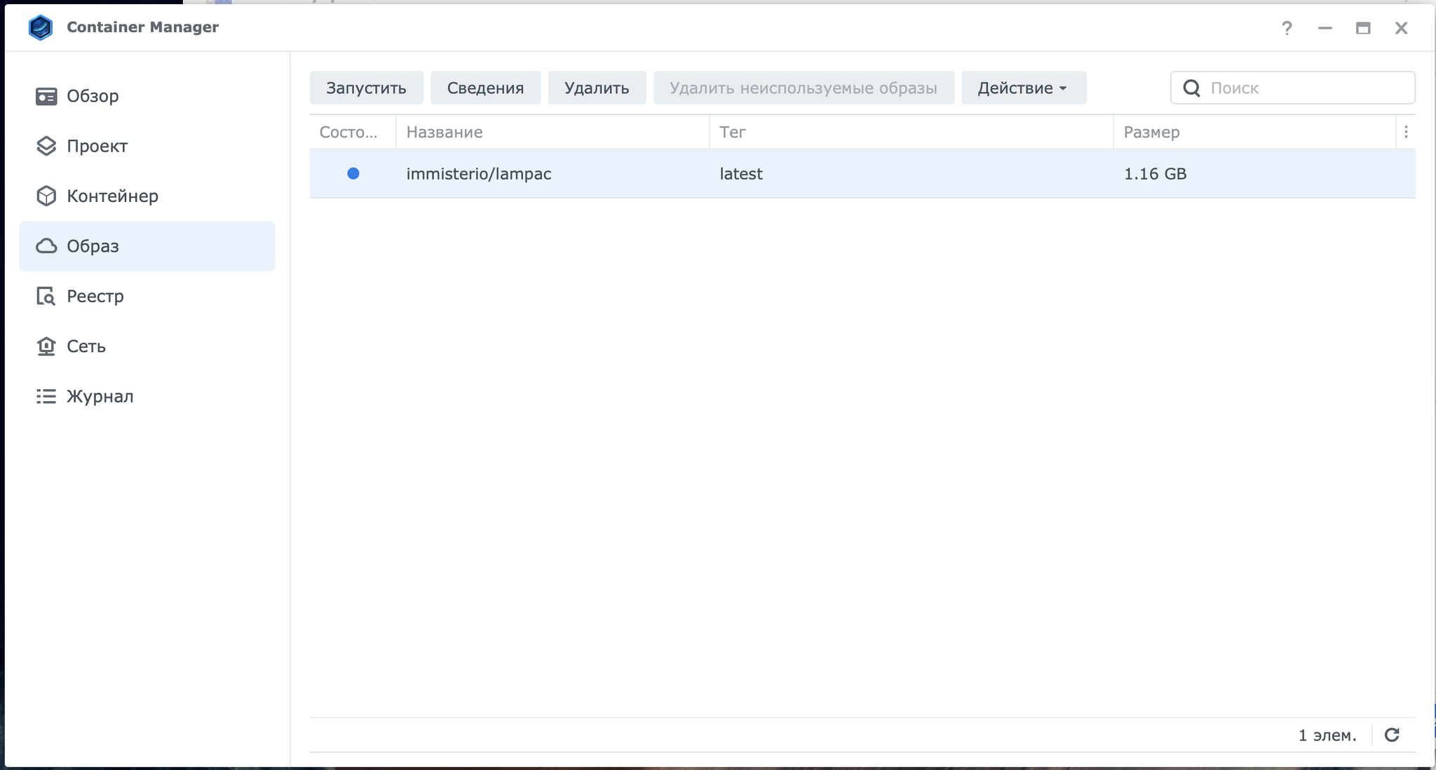 2. Открываем установленный Container Manager в разделе "Реестр" пишем immisterio/lampac. Далее выбираем latest и загрузить.