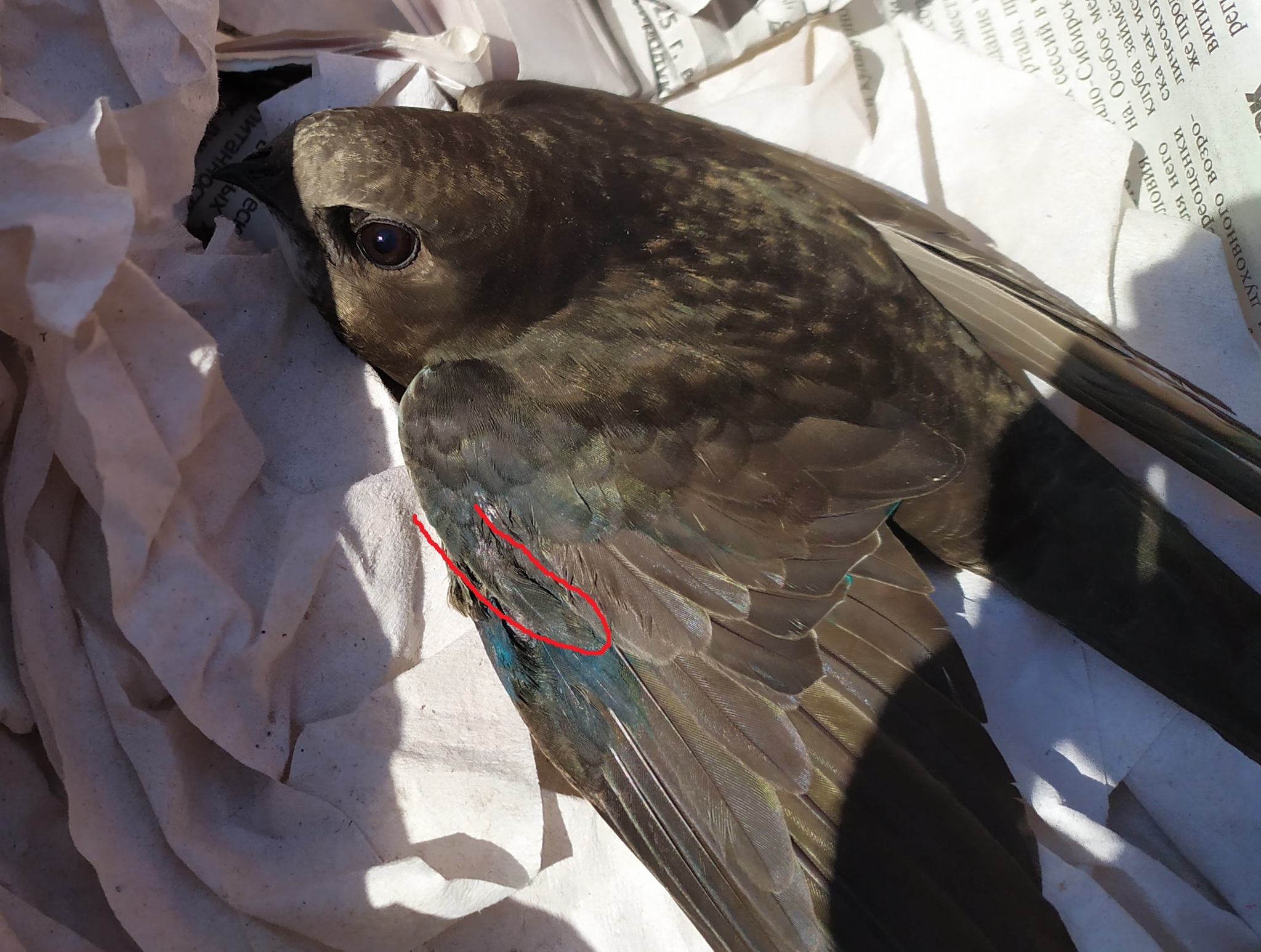 7 swift123 Сможет ли стриж летать? 7 месяцев назад Подобрал стрижа с раненым крылом. Было не мало крови. Ветеринары только намазали крыло зеленкой. Больше ничем не смогли помочь. Часть крыла (выделена красным) иногда торчит. Возможно ли вернуть его способность летать? Вопрос Спроси Пикабу Нужен совет Консультация Стриж Птицы Орнитология Животные Ещё 0