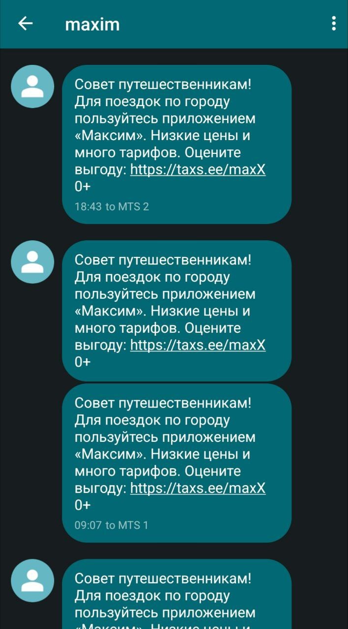 За двое суток получил 5 смс от сервиса такси "Максим" которым никогда не пользовался, причем на два разных номера