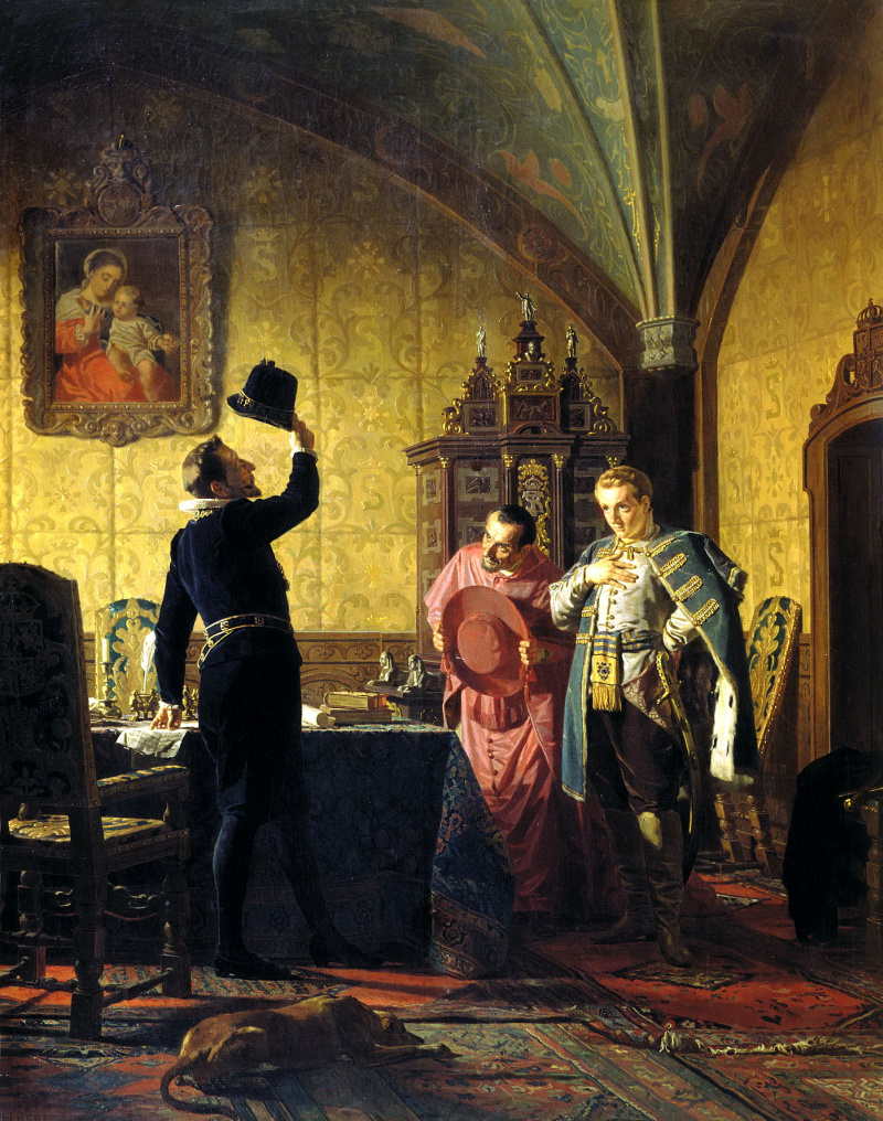 Вторая версия гласит о том, что Вишневецкий как-то раз разгневался на чересчур нерасторопного слугу и ударил его по лицу, на что слуга упрекнул князя, что тот не знает, на кого поднял руку и раскрыл свое имя. Согласно третьему варианту, Лжедмитрий открылся Константину Вишневецкому (родственник Адама Вишневецкого), когда увидел в его свите панну Марину Мнишек. Воспылав к ней любовью, он якобы положил на ее подоконник признание в своём «царственном происхождении». Марина немедля донесла об этом отцу, тот сообщил Константину Вишневецкому, и в конечном итоге весть о том, что спасённый царевич появился в Польше, стала всеобщим достоянием...