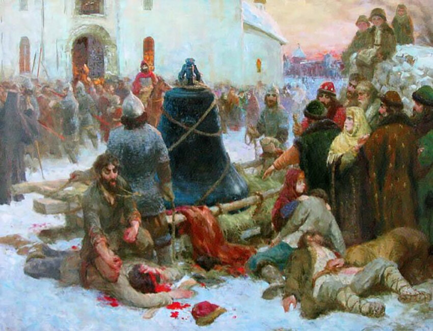 Так как сыновей у Федора не было, в случае его смерти престол мог перейти еще одному сыну Грозного, Дмитрию, родившемуся от последнего брака Ивана с Марией Нагой. Согласно церковным законам того времени, повторный брак был крайне нежелательным мероприятием и допускался либо в случае смерти одного из супругов, либо, если брак получался бездетным, либо в случае пострига супруги в монастырь. При чем даже в таких случаях жениться можно было не более трех раз. У Ивана же было около 8 жен (точное число до сих пор является предметом исторического спора). После смертей первых трех жен царь получил разрешение от церкви на четвёртый брак, однако все последующие браки благословлены не были. В глазах церкви царевич Дмитрий был незаконно рожденным и не имел право претендовать на престол. После смерти Грозного он вместе с матерью был отправлен на постоянное жительство в город Углич. 15 мая 1591 года Дмитрий Иоаннович был найден лежащим на земле с перерезанным горлом в Угличском кремле. После обнаружения тела по приказу Марии Нагой забили в набат, который собрал жителей на главной площади города. Царица объявила о случившемся и обвинила в убийстве Осипа Волохова, Никиту Качалова и Данилу Битяговского, сына дьяка Михаила, присланного надзирать за опальной царской семьей, которые якобы выполняли приказ Бориса Годунова. В Угличе вспыхнули беспорядки и разъярённая толпа тут же растерзала всех обвиненных в убийстве.