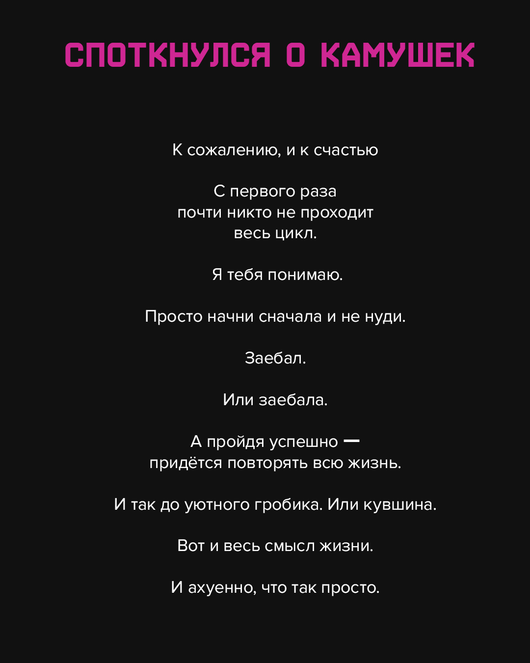 Но я знаю, что все, кто на меня подписаны — ахереть какие талантливые, не ведутся на большинство и ищут свой уникальный путь. Хочу в это верить и просто не пишите мне, если не согласны. Разбирайтесь с этим сами.