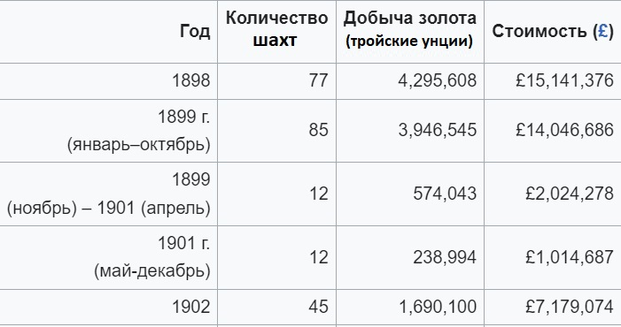 Непосредственно из Трансвааля информацию об объемах золотодобычи сообщал корреспондент петербургской газеты "Новое время" Алексей Ефимович Едрихин (псевдоним: Вандам), поручик запаса, в 1899 г. завершивший обучение в Николаевской академии Генерального штаба: "В стране начиная с 1887 по 1896 г. добыто 660 ООО фунтов золота, ценностью в 406 250 рублей. Добыча производилась в следующей постепенности: в 1887 г. - на 840 тысяч рублей; в 1888 г. - на 7 570 тысяч; в 1889 - на 13 452 тысячи; в 1890 г. - на 18 111 тысяч; в 1891 г. - на 26 554 тысячи; в 1892 г. - на 44 741 тысячу; в 1893 г. - на 53 816 тысяч; в 1894г.- на 73 860 тысяч; в 1895г.- на 81 475 тысяч и в 1896г.- на 86 миллионов рублей... Теперь возьмем другой расчет: в 1896 г. при 3 000 машин, дробивших камень, было добыто 150 000 фунтов золота, а уже перед войной, кроме вновь заказанных, было в работе более 7000 машин. При таких условиях самая минимальная добыча золота ежегодно [составляла] 300 000 рублей [фунтов?]" ("Письма о Трансваале", "Новое время" №8690, 8/21 мая 1900 г.). На рубеже XIX-XX вв. соотношение рубля к фунту стерлингов составляло примерно 9,5 руб. за 1 фунт.
