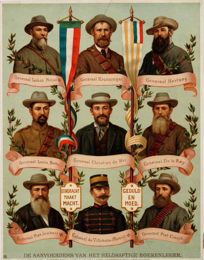 К илл. - Граф де Вильбуа-Марейль (в нижнем ряду, в центре) среди бурских командиров на трансваальском плакате. Современники вспоминали, что он открыто расхаживал по Претории во французском офицерском мундире со знаками различия, нарушая свой статус иностранного добровольца на службе республики Трансвааль.