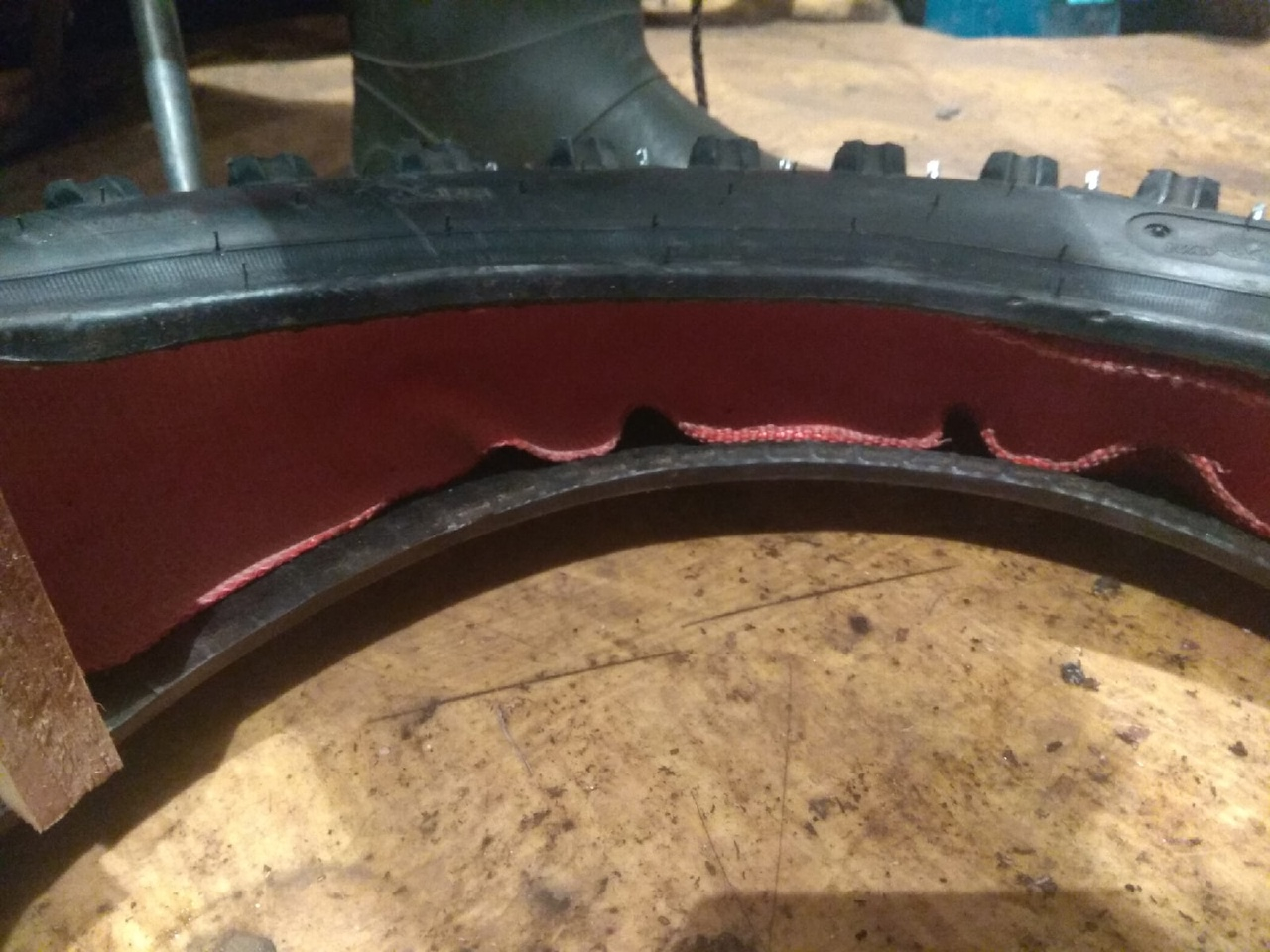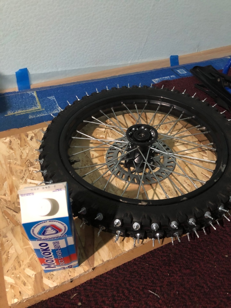 для снежных покатушек зашиповали кровельными саморезами старую резину. пит идет как по рельсам на укатанном снегу. пухляк берет с трудом. 1000р на колесо. внутри пожарный рукав. последнее фото после перешиповки колеса.