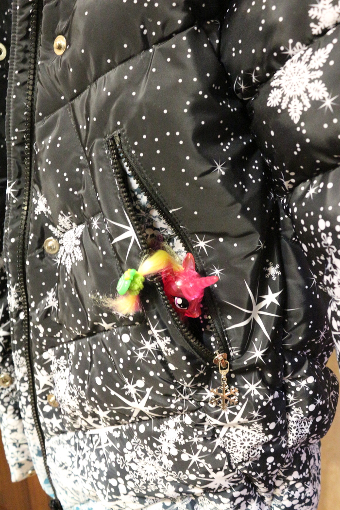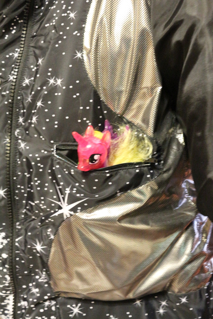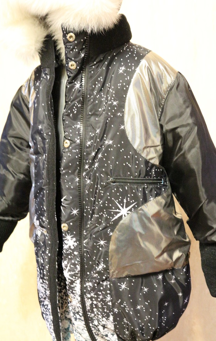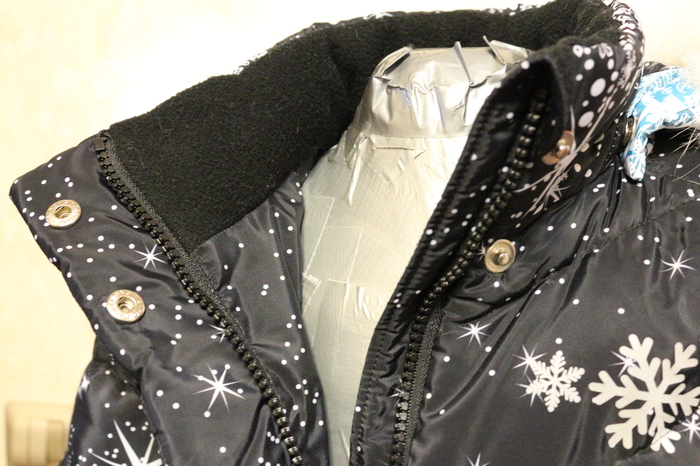 Собран подклад, сделан внутренний кармашек на молнии, вшит воротник. В рукавах обычная п\э подкладка,т.к. дочь часто ходит с коротким рукавом, а фольгированная подкладка к голой коже не очень ей нравится. Сделана внутренняя планка под замок. В этот раз не делала защитную юбку-опять же дочери не нравится с ней возится, к тому же задирается юбка от формы, а делать ниже юбки-неудобно ходить, пальто довольно длинное-не замерзнет.