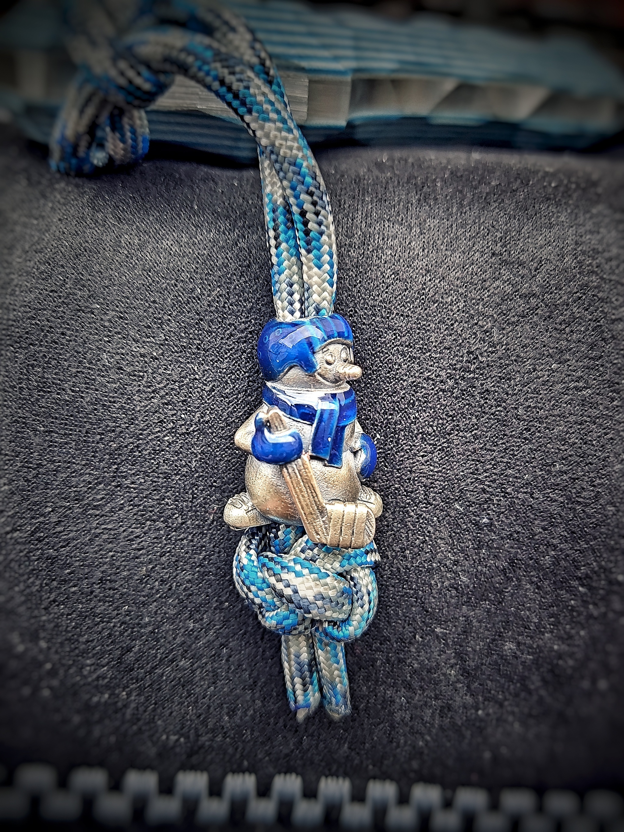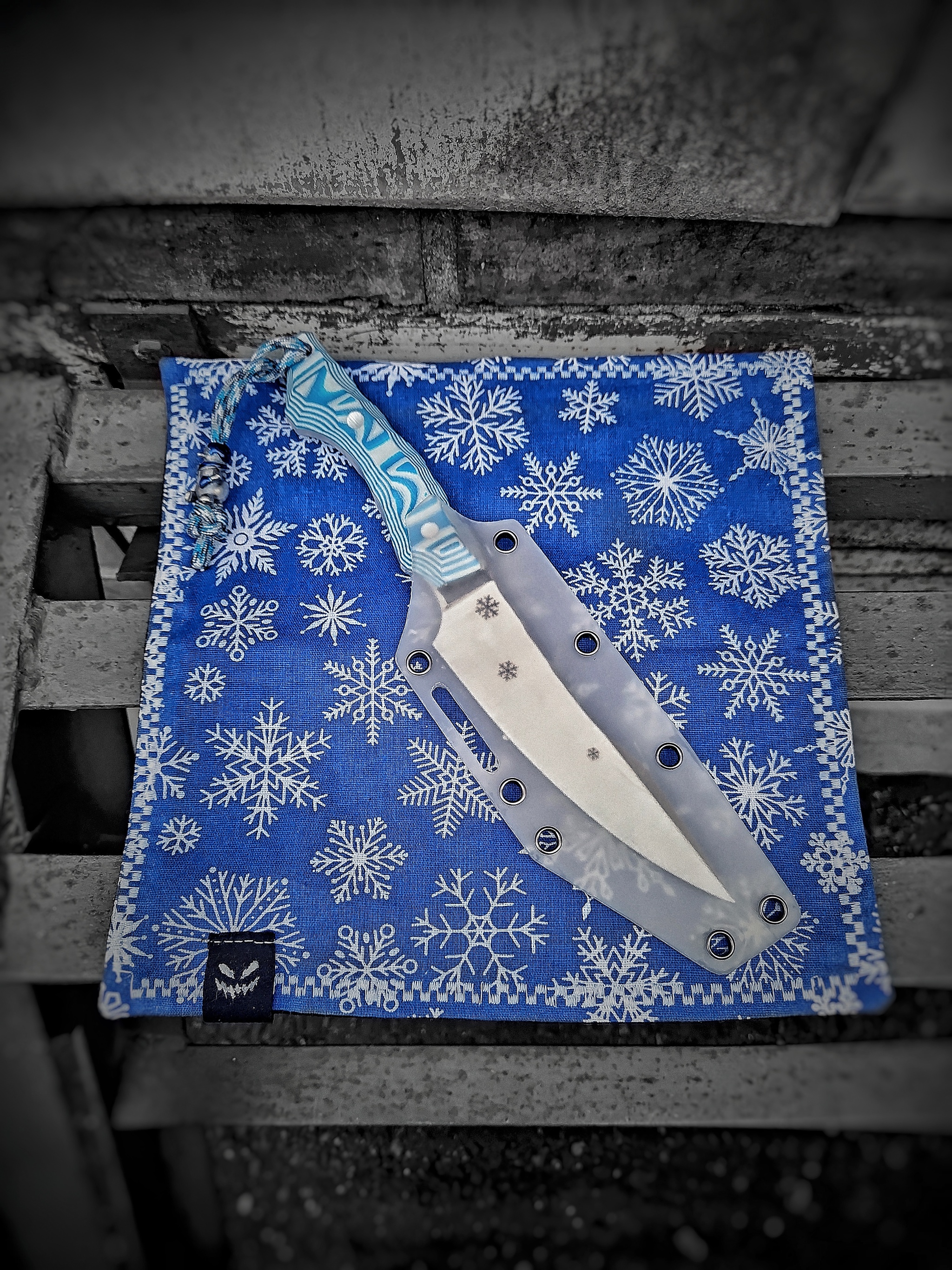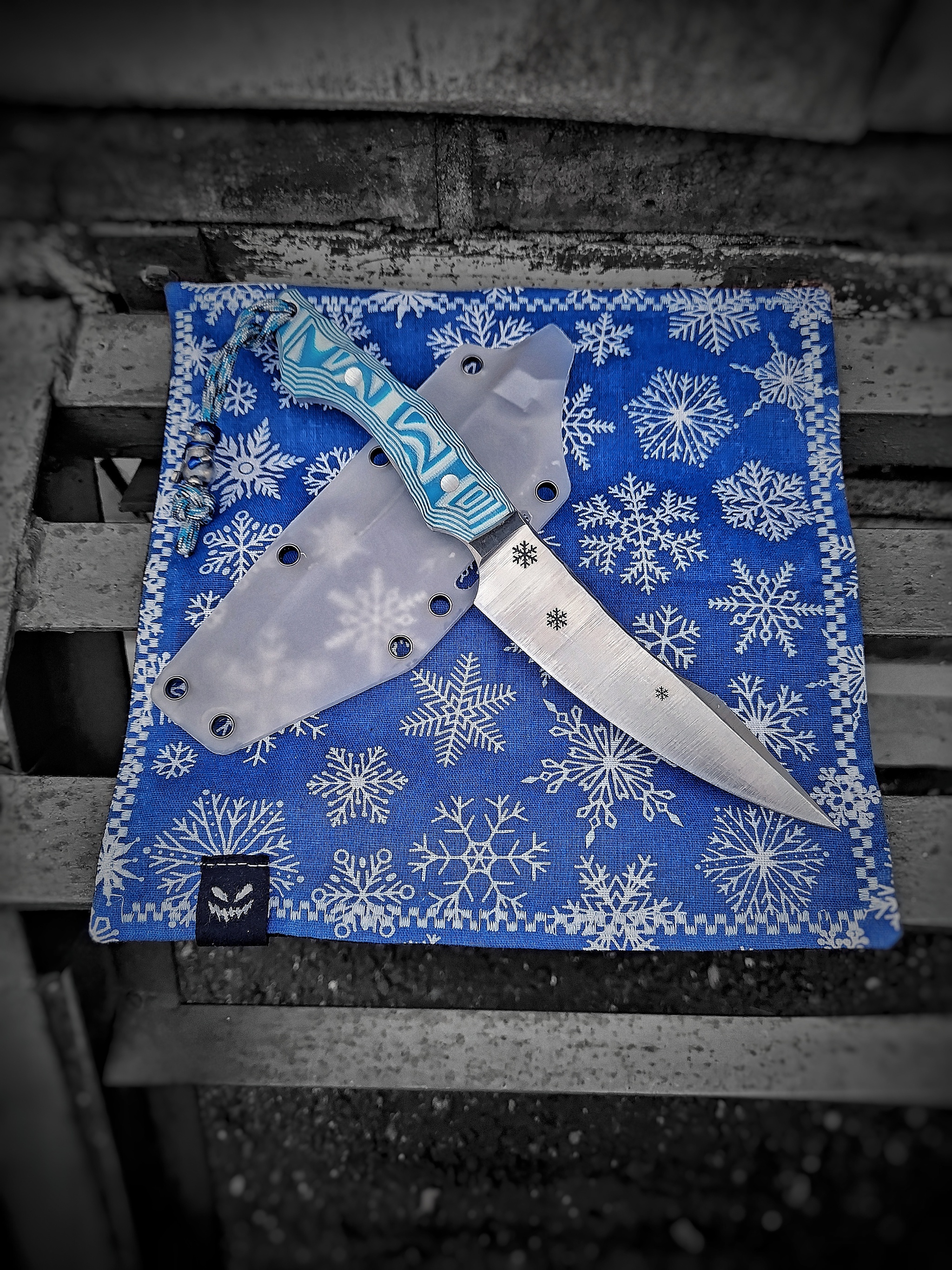 сталь 95х18, бело-голубая G10, ножны полупрозрачный кайдекс, бусина от КОНТ, мельхиор, эмаль. Хэнк также был в наборе.