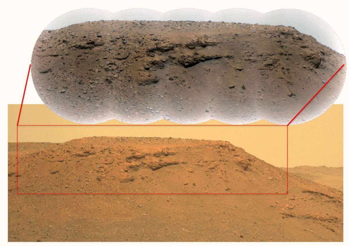 Этот новый анализ базируется на снимках пород, выходящих на поверхность внутри кратера с его западной стороны. Исследования, проведенные ранее при помощи орбитальных аппаратов, показали, что этот выход пласта на поверхность, наблюдаемый сверху, напоминает речные дельты на Земле, где слои осадочных пород располагаются в форме веера при впадении реки в озеро.